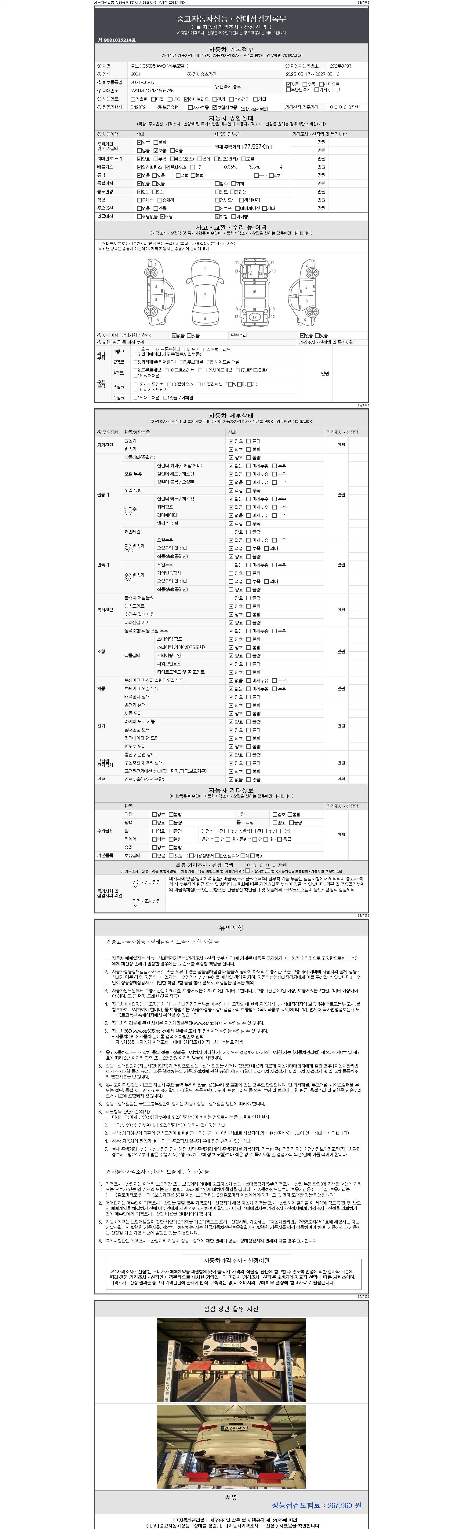 | 주행거리 | 77,597 km | 차량번호 | 202루8496 | 사고유무 | 성능기록부 참조 | 제시번호 | 제 2147483647 호 |