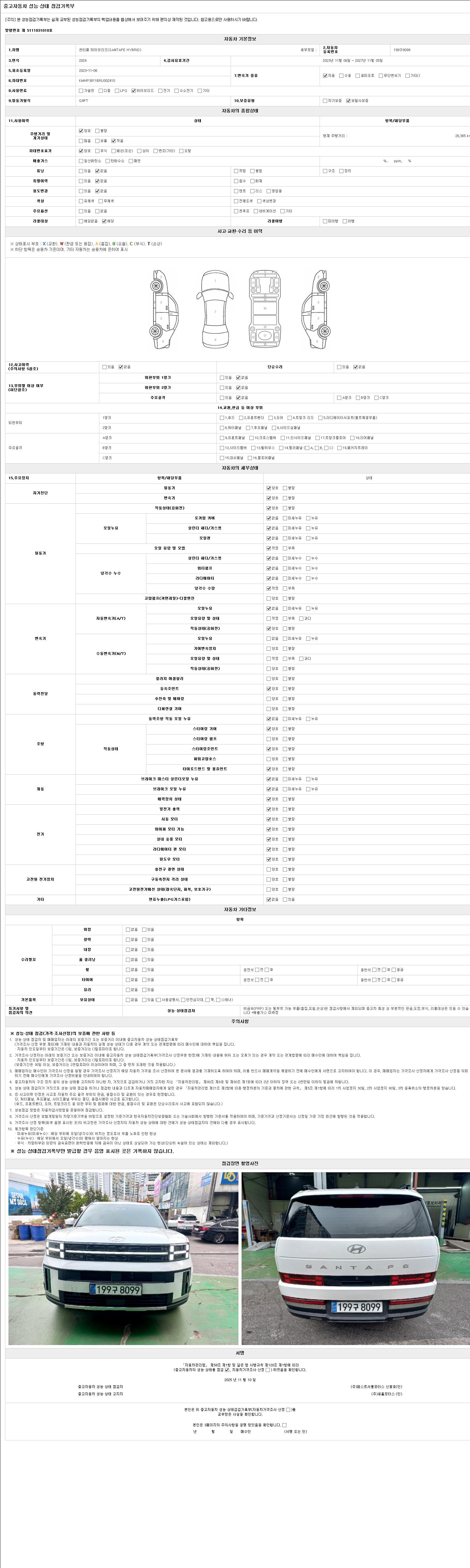 자동차관리법 시행규칙 제120조의 규정에 따라 별지 제 82호서식 《중고자동차 성능, 상태점검 기록부》를 발행한 성능, 상태점검자 및 매매자는 아래의 보증기간 또는 보증거리 이내의 중고자동차, 성능점검 기록부에 기재된 내용과 자동차의 실제 성능, 상태가 다른 경우 계약 또는 관계법령에 따라 매수인에 대하여 책임을 집니다.