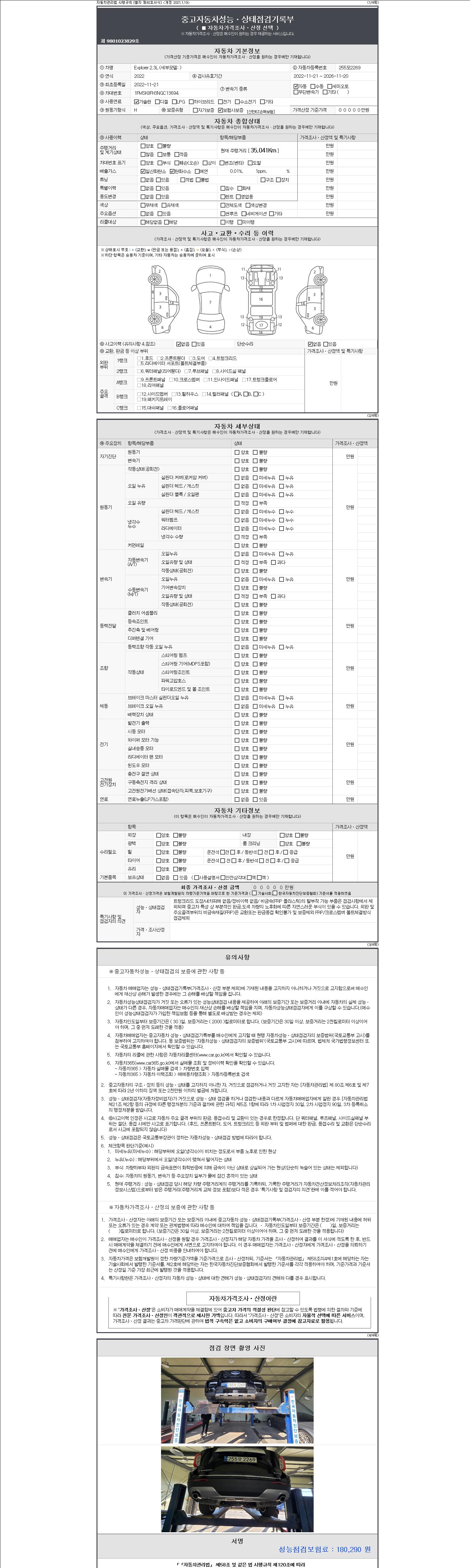 자동차관리법 시행규칙 제120조의 규정에 따라 별지 제 82호서식 《중고자동차 성능, 상태점검 기록부》를 발행한 성능, 상태점검자 및 매매자는 아래의 보증기간 또는 보증거리 이내의 중고자동차, 성능점검 기록부에 기재된 내용과 자동차의 실제 성능, 상태가 다른 경우 계약 또는 관계법령에 따라 매수인에 대하여 책임을 집니다.