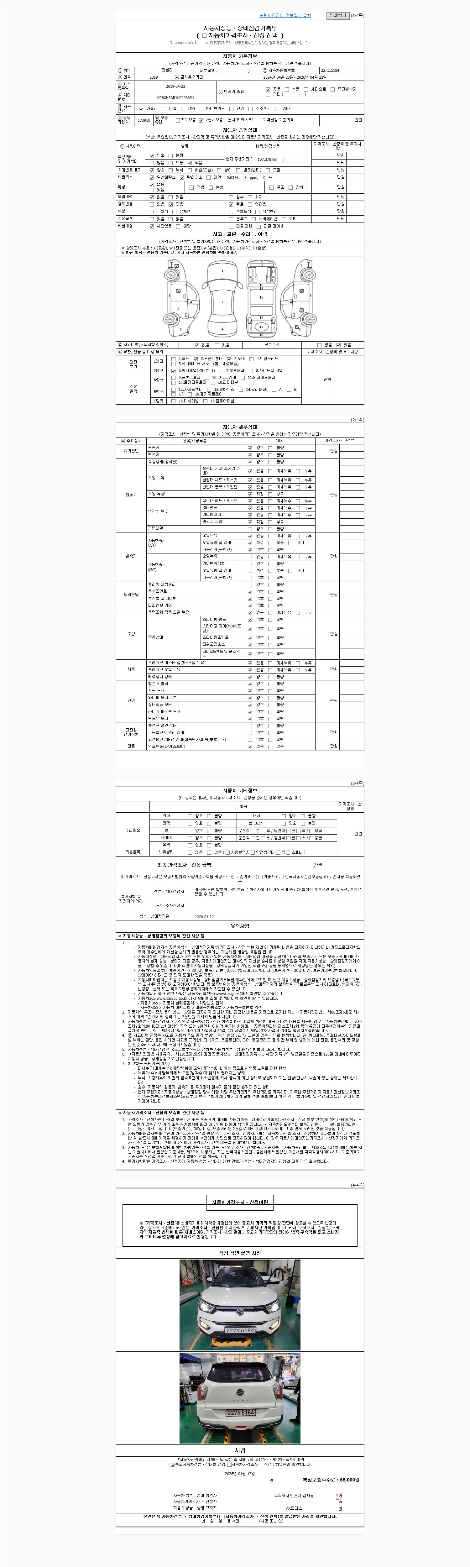 | 주행거리 | 107,000 km | 차량번호 | 227조5184 | 사고유무 | 성능기록부 참조 | 제시번호 | 제 2026002065 호 |