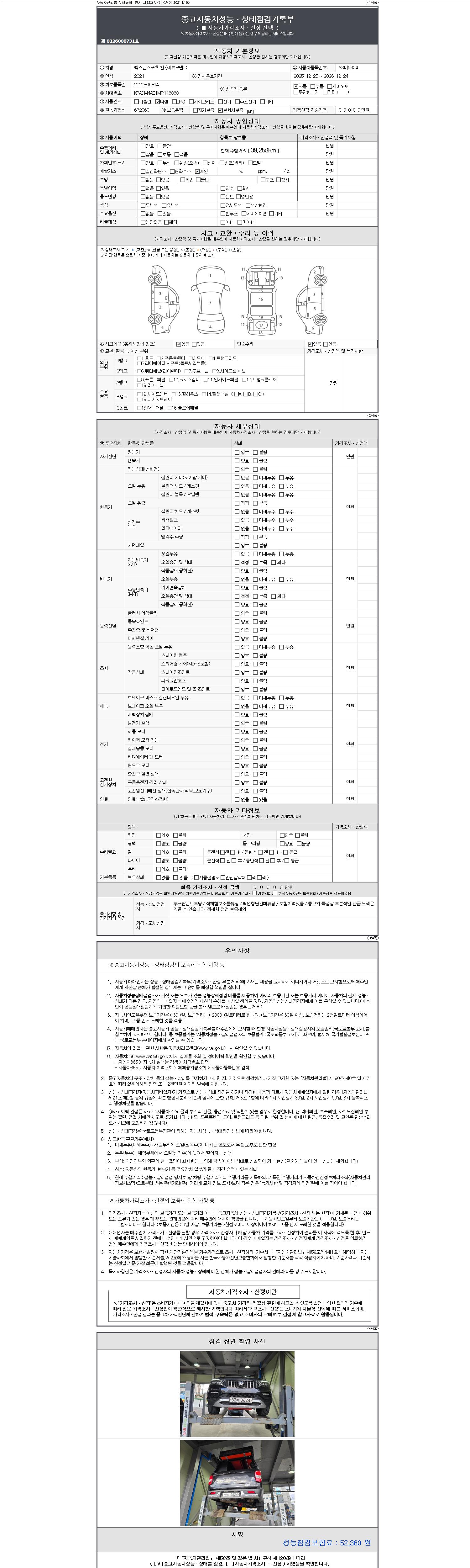 | 주행거리 | 39,258 km | 차량번호 | 83버0624 | 사고유무 | 성능기록부 참조 | 제시번호 | 제 2147483647 호 |