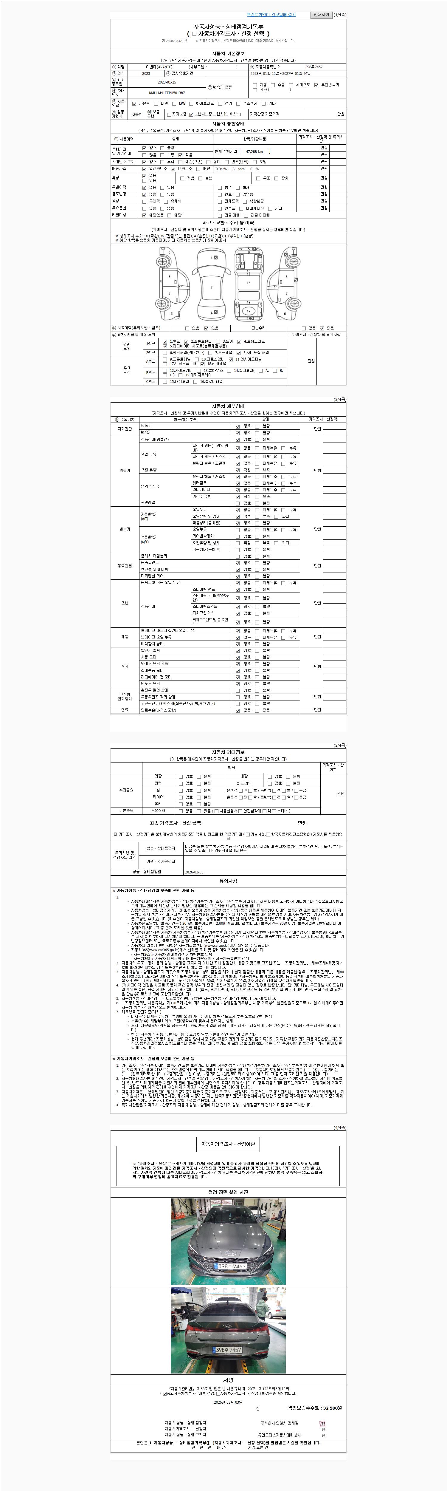 | 주행거리 | 47,288 km | 차량번호 | 398주7457 | 사고유무 | 성능기록부 참조 | 제시번호 | 제 2026010588 호 |