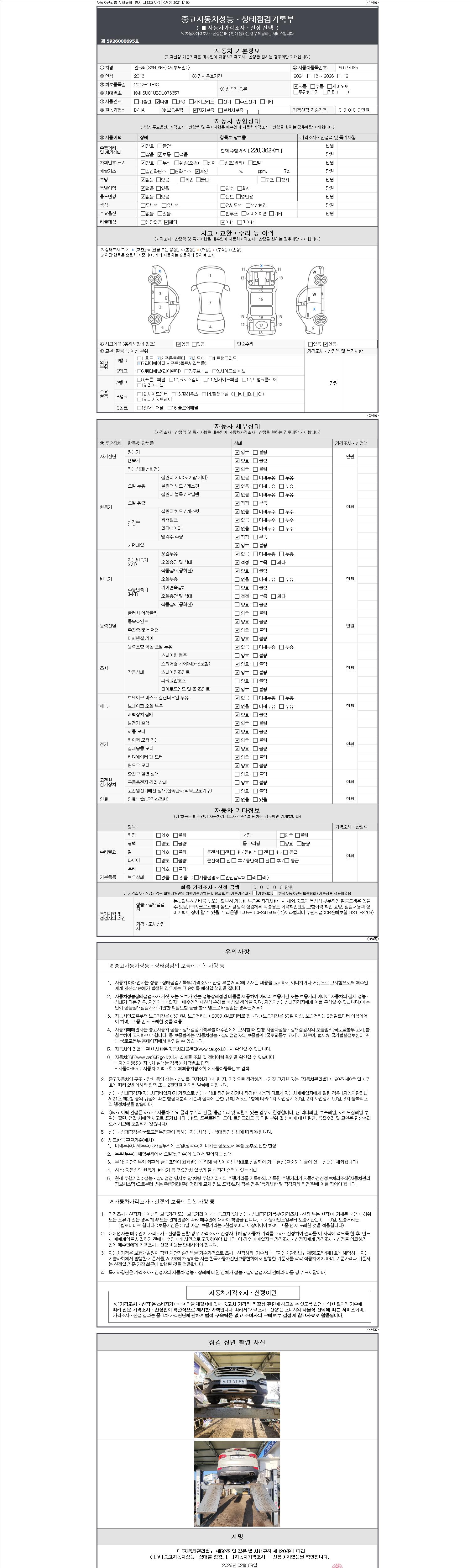 -중고자동차 매매업자를 통해 차량을 구입하실 경우 반드시 "중고자동차 성능, 상태점검 기록부"를 교뷰 받으셔야 하며, 매매업자는 반드시 의무 교부 하여야 압니다.