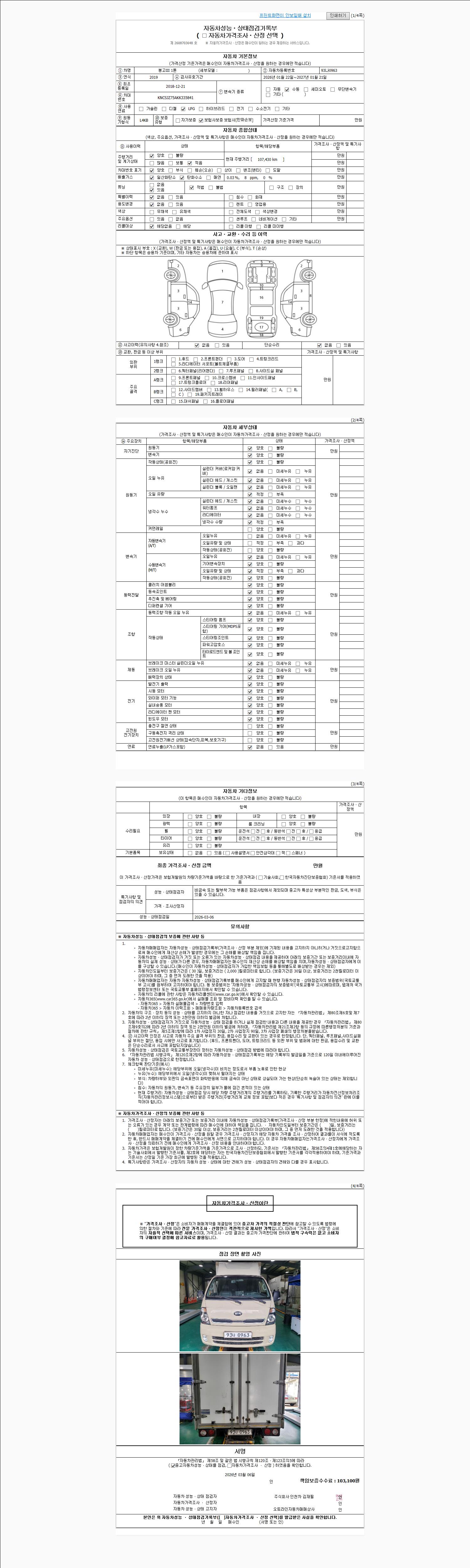 | 주행거리 | 107,430 km | 차량번호 | 93나0963 | 사고유무 | 성능기록부 참조 | 제시번호 | 제 2026011464 호 |