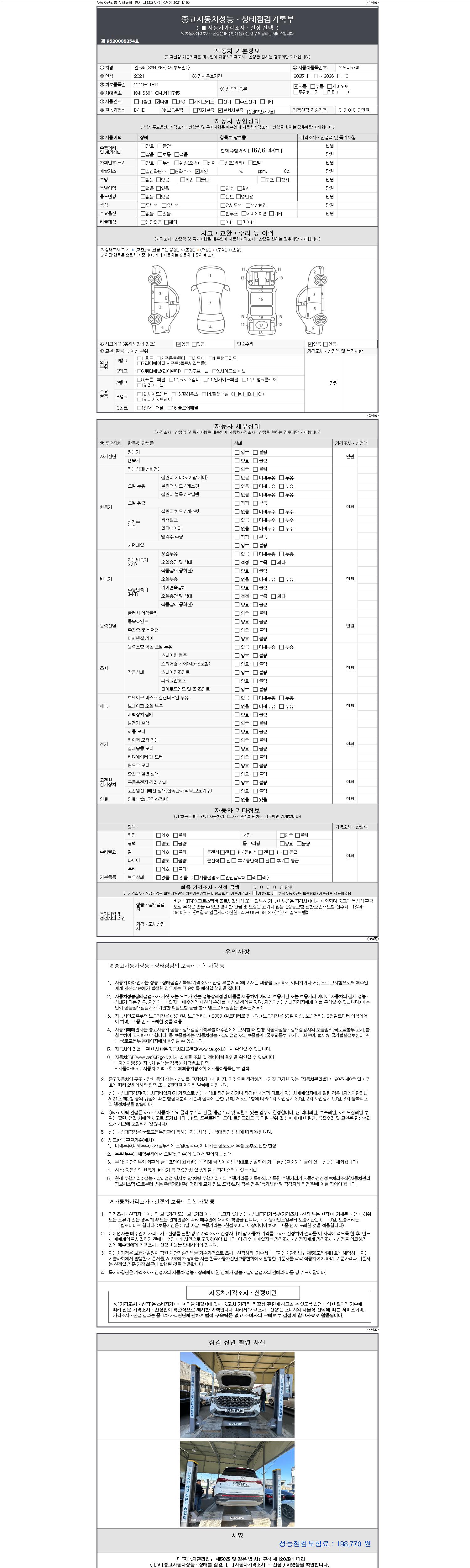 | 주행거리 | 167,614 km | 차량번호 | 325너5740 | 사고유무 | 성능기록부 참조 | 제시번호 | 제 2147483647 호 |