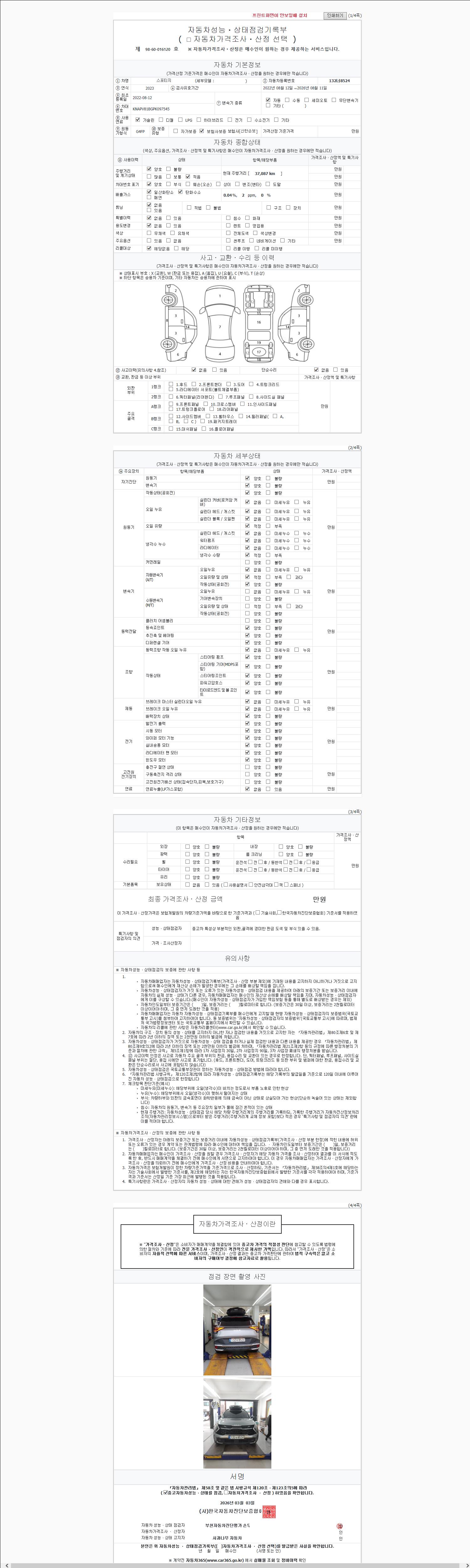 | 주행거리 | 37,090 km | 차량번호 | 132너8524 | 사고유무 | 성능기록부 참조 | 제시번호 | 제 2026040167 호 |