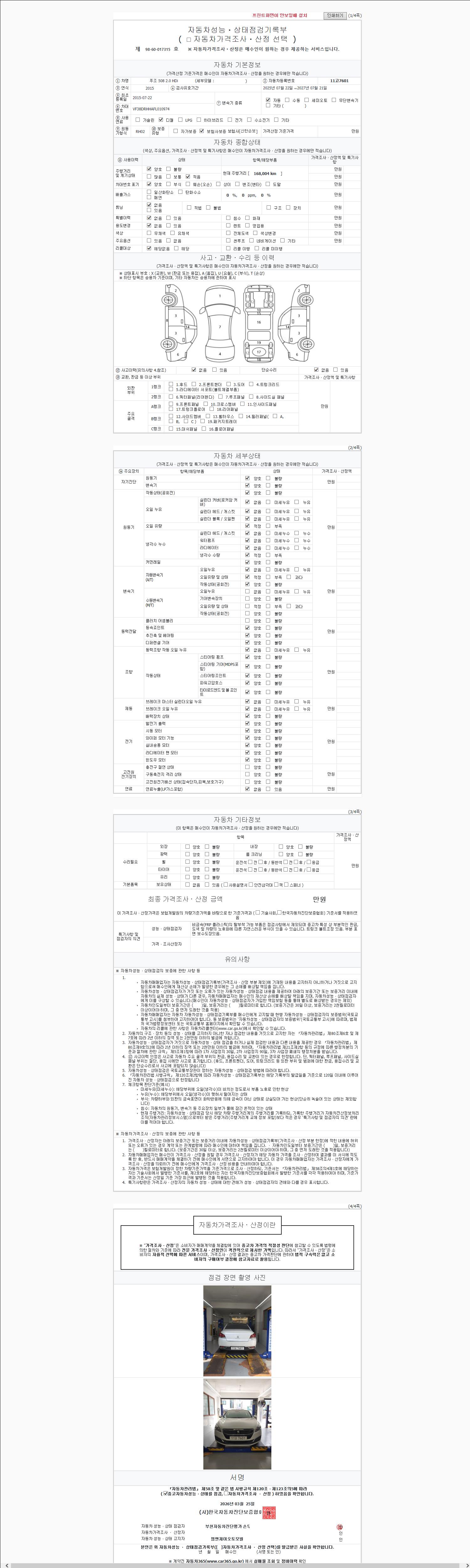 | 주행거리 | 168,004 km | 차량번호 | 11고7601 | 사고유무 | 성능기록부 참조 | 제시번호 | 제 2026056209 호 |