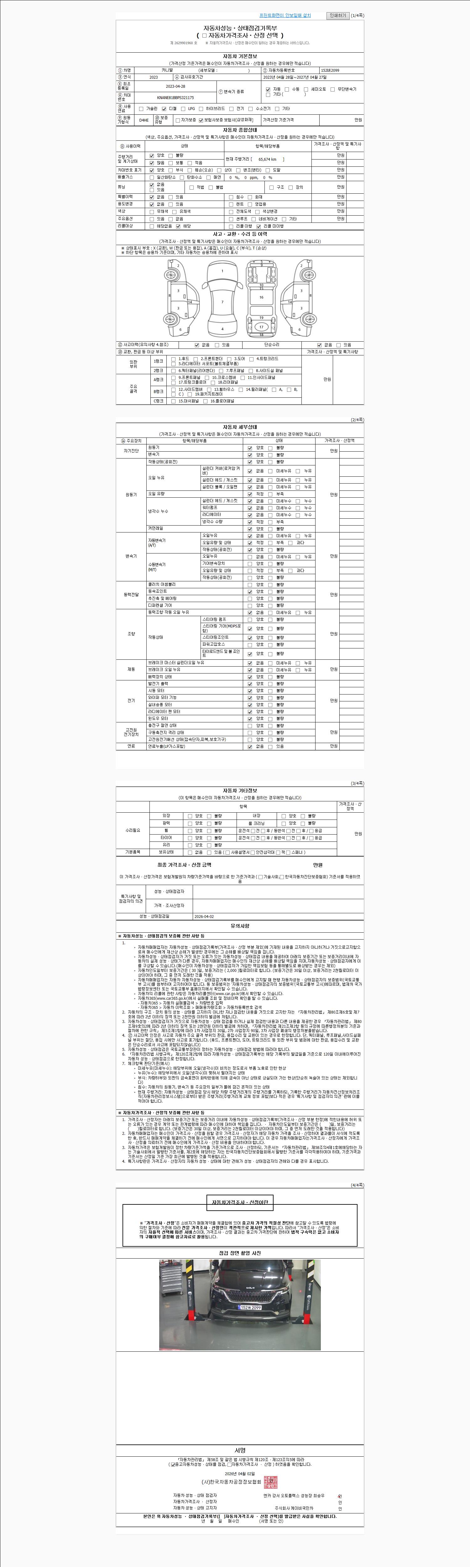 | 주행거리 | 65,674 km | 차량번호 | 152버2099 | 사고유무 | 성능기록부 참조 | 제시번호 | 제 2026042248 호 |