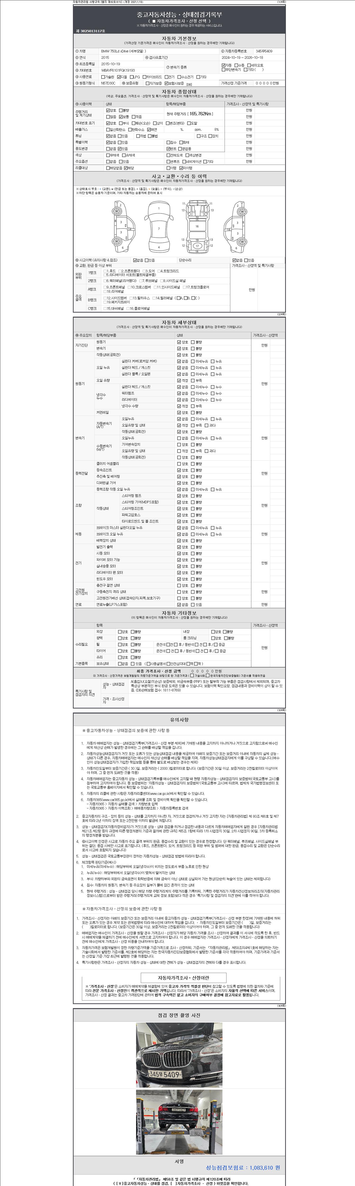 | 주행거리 | 165,762 km | 차량번호 | 345무5409 | 사고유무 | 성능기록부 참조 | 제시번호 | 제 2147483647 호 |
