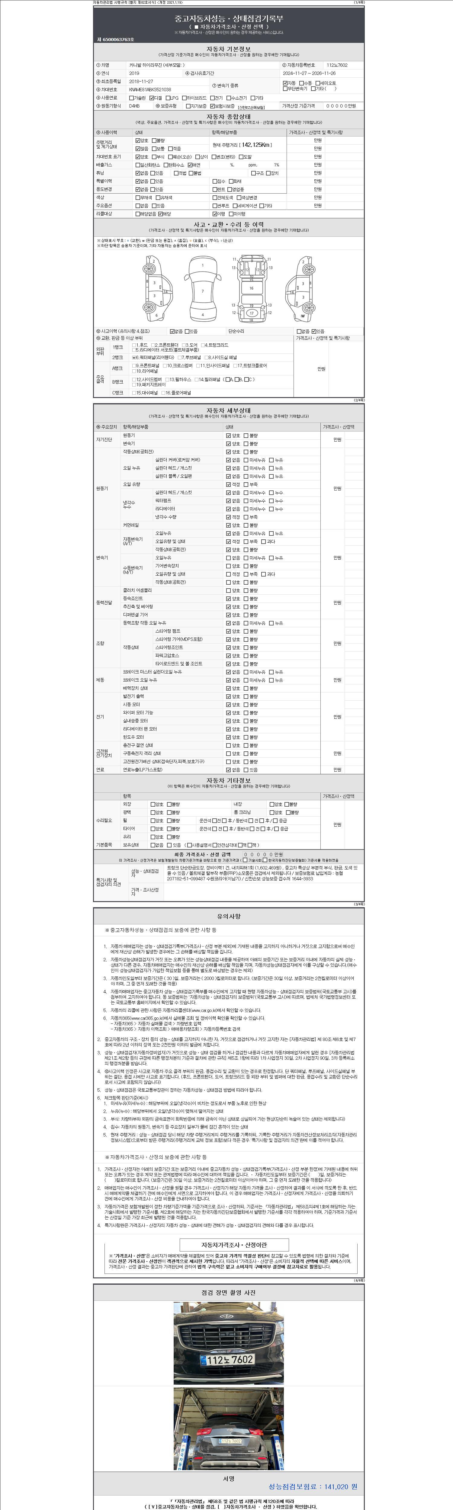 | 주행거리 | 142,125 km | 차량번호 | 112노7602 | 사고유무 | 성능기록부 참조 | 제시번호 | 제 2147483647 호 |