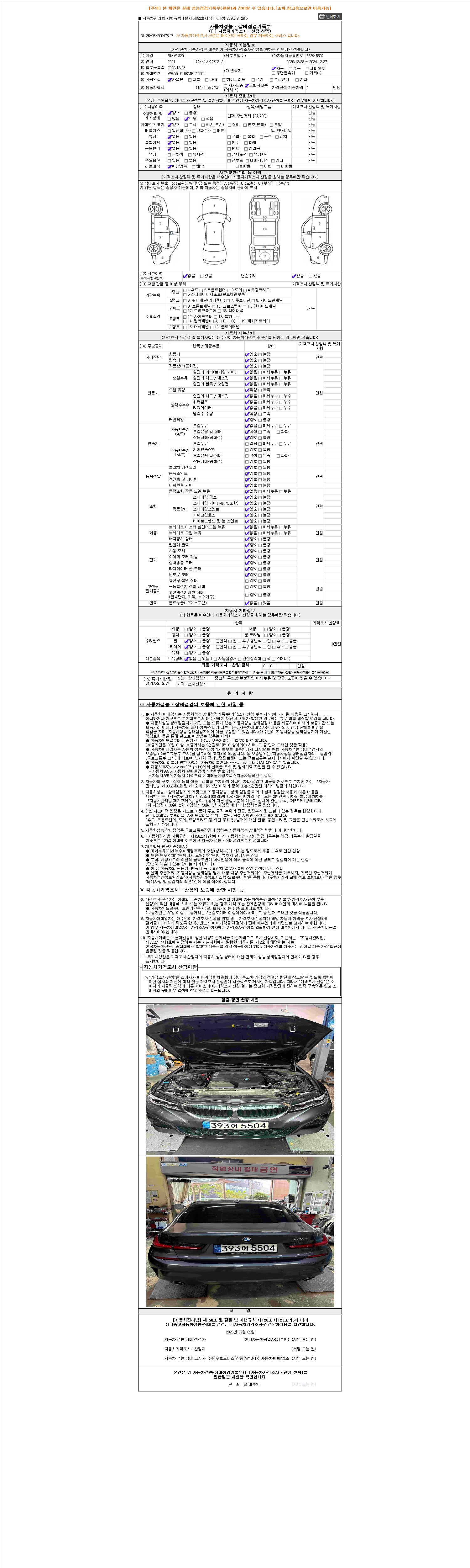 자동차관리법 시행규칙 제120조의 규정에 따라 별지 제 82호서식 《중고자동차 성능, 상태점검 기록부》를 발행한 성능, 상태점검자 및 매매자는 아래의 보증기간 또는 보증거리 이내의 중고자동차, 성능점검 기록부에 기재된 내용과 자동차의 실제 성능, 상태가 다른 경우 계약 또는 관계법령에 따라 매수인에 대하여 책임을 집니다.