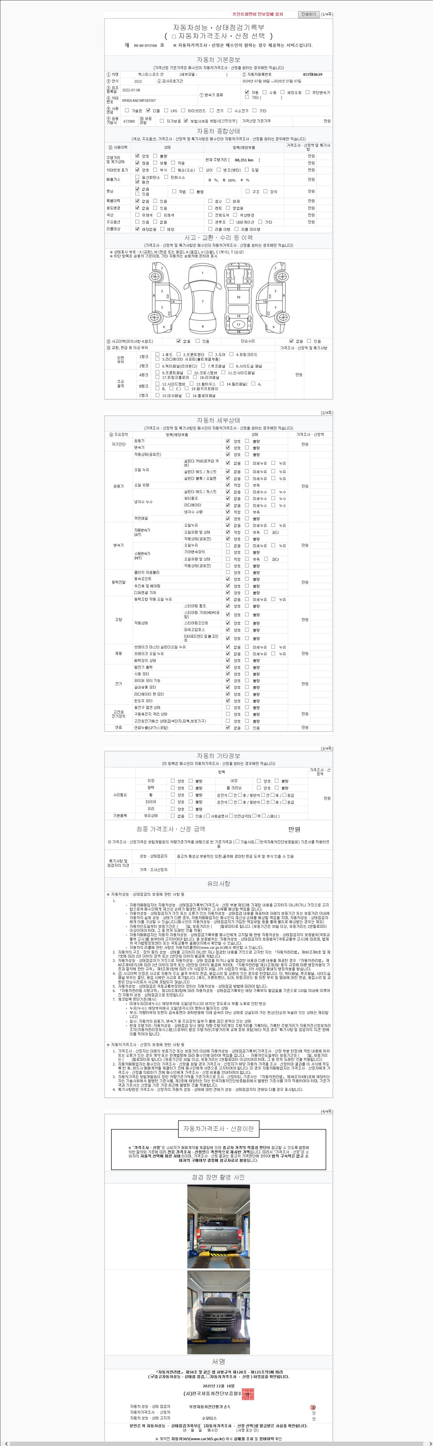 | 주행거리 | 88,351 km | 차량번호 | 837머8629 | 사고유무 | 성능기록부 참조 | 제시번호 | 제 2025234659 호 |