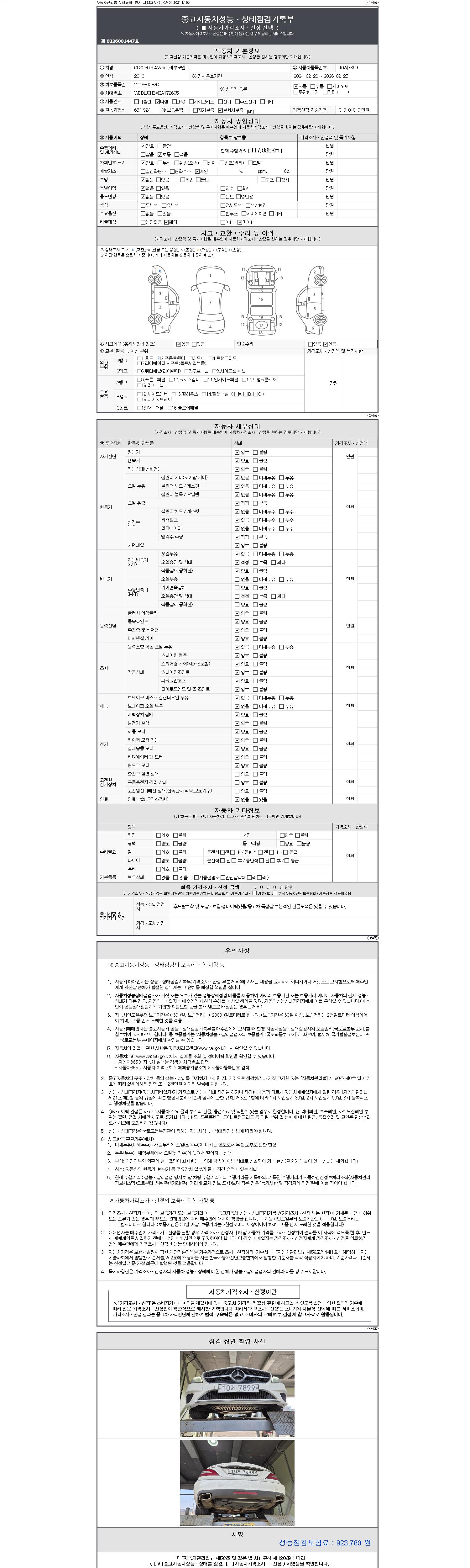 | 주행거리 | 117,885 km | 차량번호 | 10저7899 | 사고유무 | 성능기록부 참조 | 제시번호 | 제 2147483647 호 |