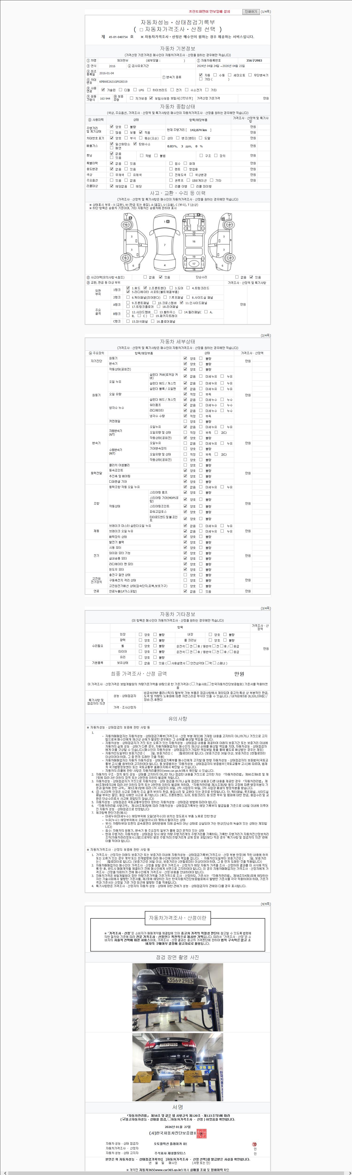 | 주행거리 | 142,074 km | 차량번호 | 356구2983 | 사고유무 | 성능기록부 참조 | 제시번호 | 제 2147483647 호 |