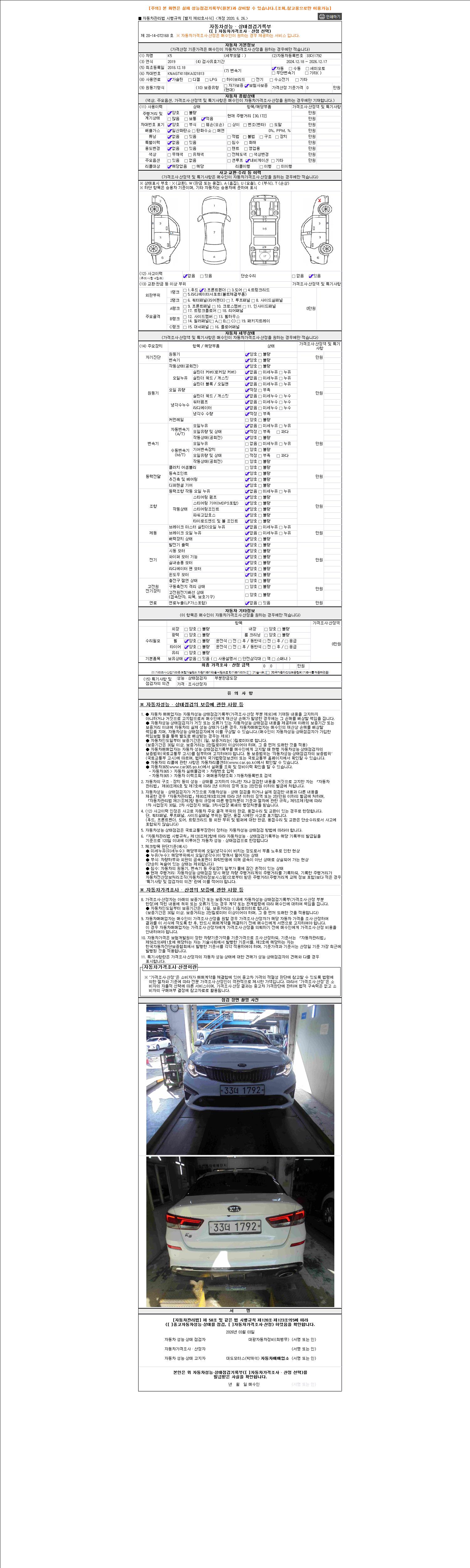 자동차관리법 시행규칙 제120조의 규정에 따라 별지 제 82호서식 《중고자동차 성능, 상태점검 기록부》를 발행한 성능, 상태점검자 및 매매자는 아래의 보증기간 또는 보증거리 이내의 중고자동차, 성능점검 기록부에 기재된 내용과 자동차의 실제 성능, 상태가 다른 경우 계약 또는 관계법령에 따라 매수인에 대하여 책임을 집니다.