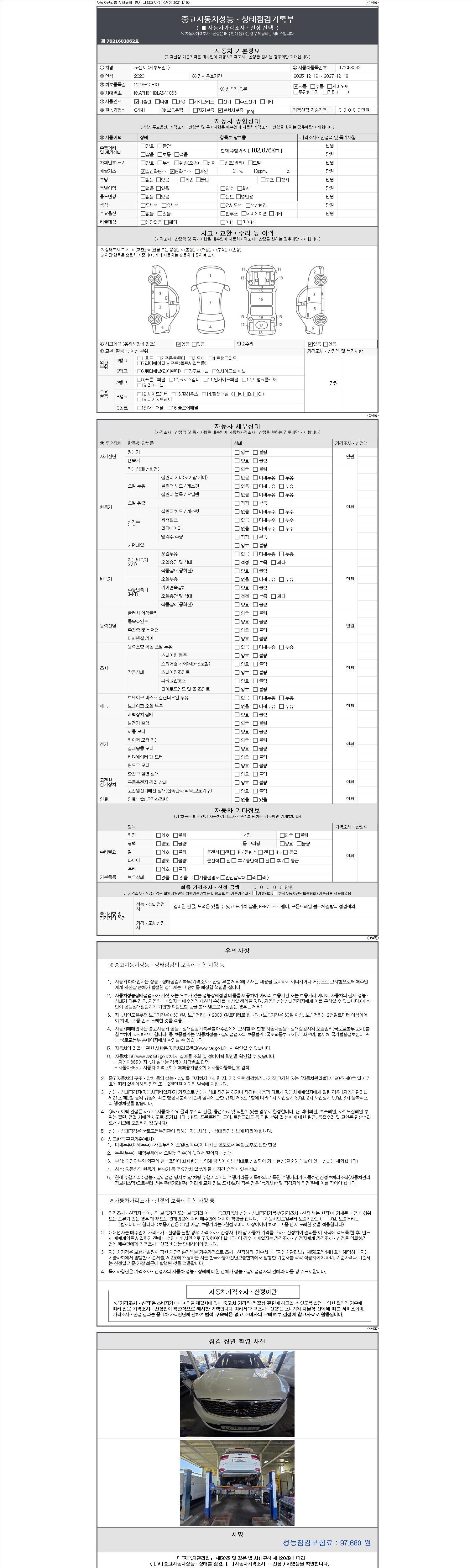 -중고자동차 매매업자를 통해 차량을 구입하실 경우 반드시 "중고자동차 성능, 상태점검 기록부"를 교뷰 받으셔야 하며, 매매업자는 반드시 의무 교부 하여야 압니다.