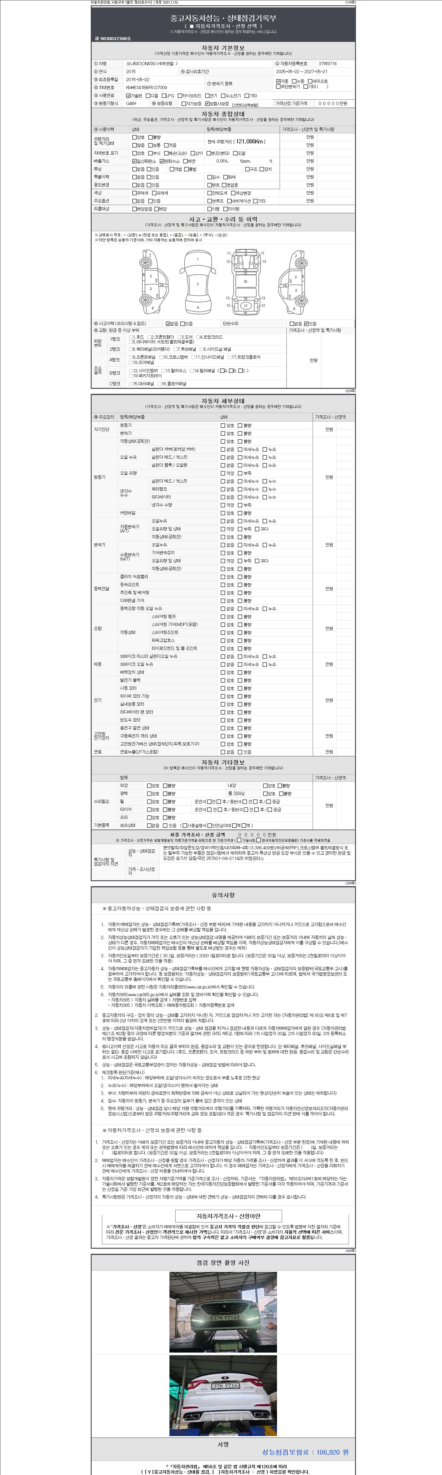 | 주행거리 | 121,086 km | 차량번호 | 37버9716 | 사고유무 | 성능기록부 참조 | 제시번호 | 제 2147483647 호 |