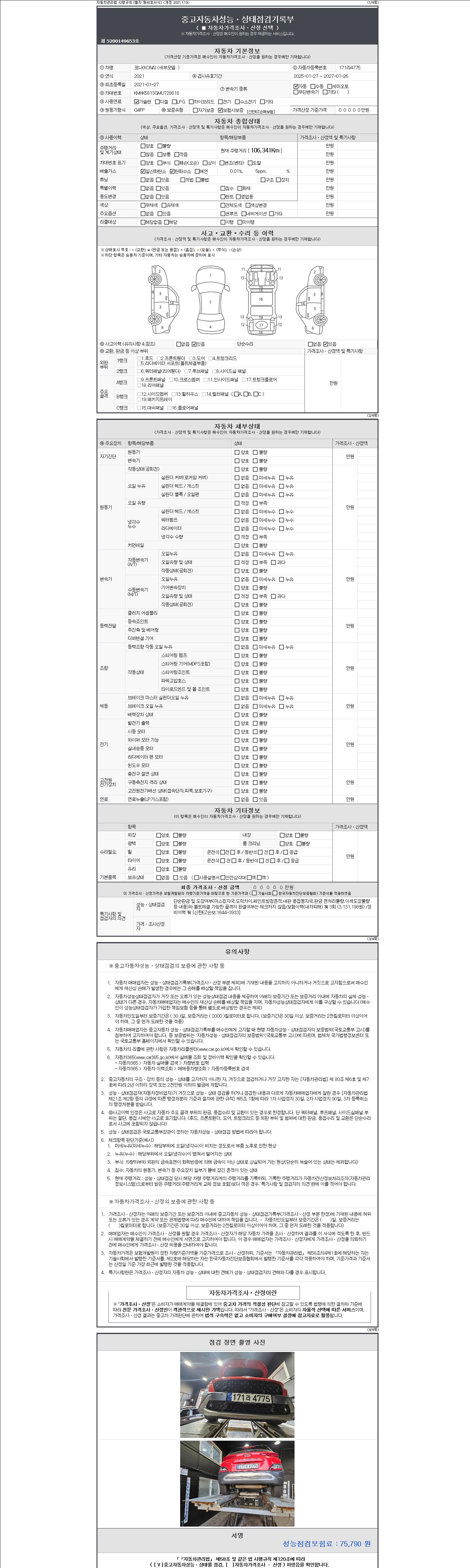 | 주행거리 | 106,341 km | 차량번호 | 171라4775 | 사고유무 | 성능기록부 참조 | 제시번호 | 제 2147483647 호 |