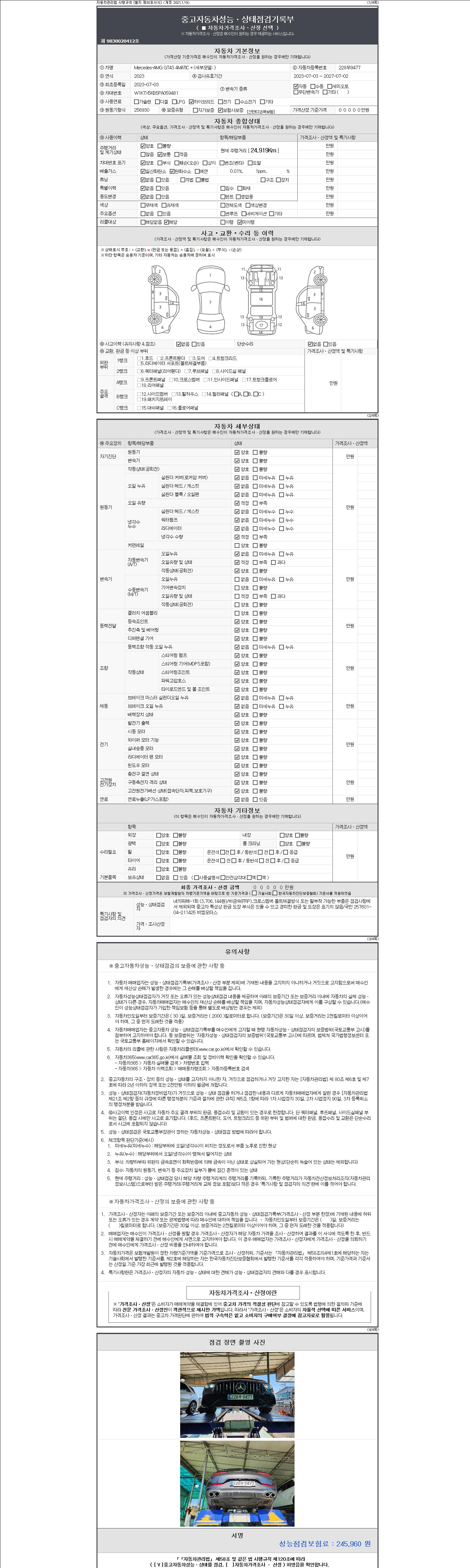 | 주행거리 | 24,919 km | 차량번호 | 228무9477 | 사고유무 | 성능기록부 참조 | 제시번호 | 제 2147483647 호 |