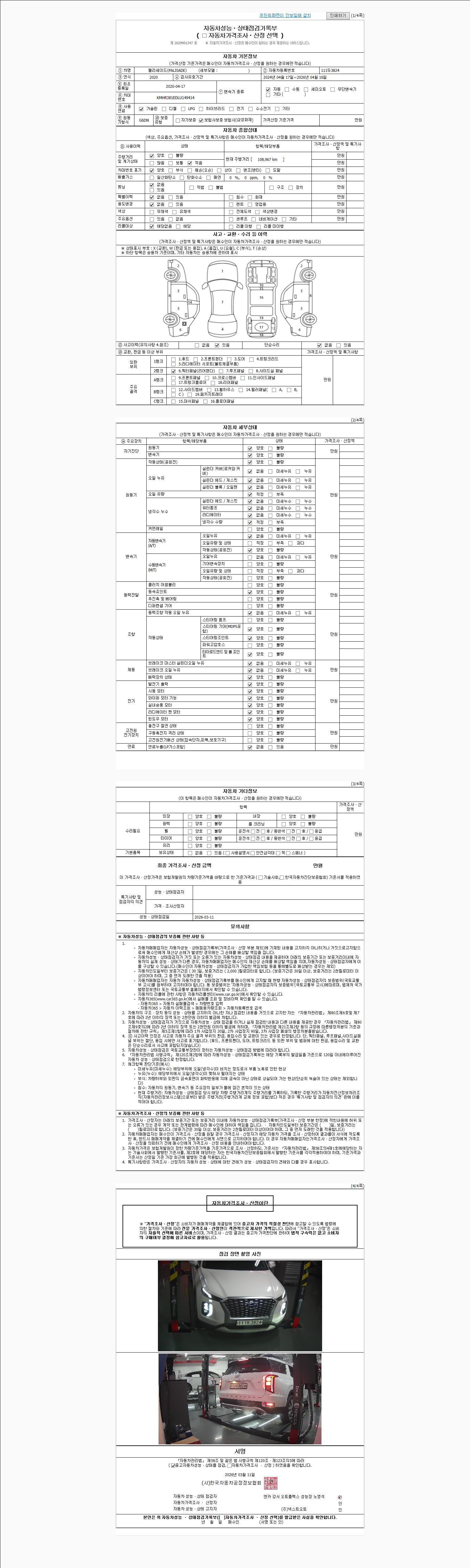 | 주행거리 | 108,970 km | 차량번호 | 111두3824 | 사고유무 | 성능기록부 참조 | 제시번호 | 제 2026030468 호 |
