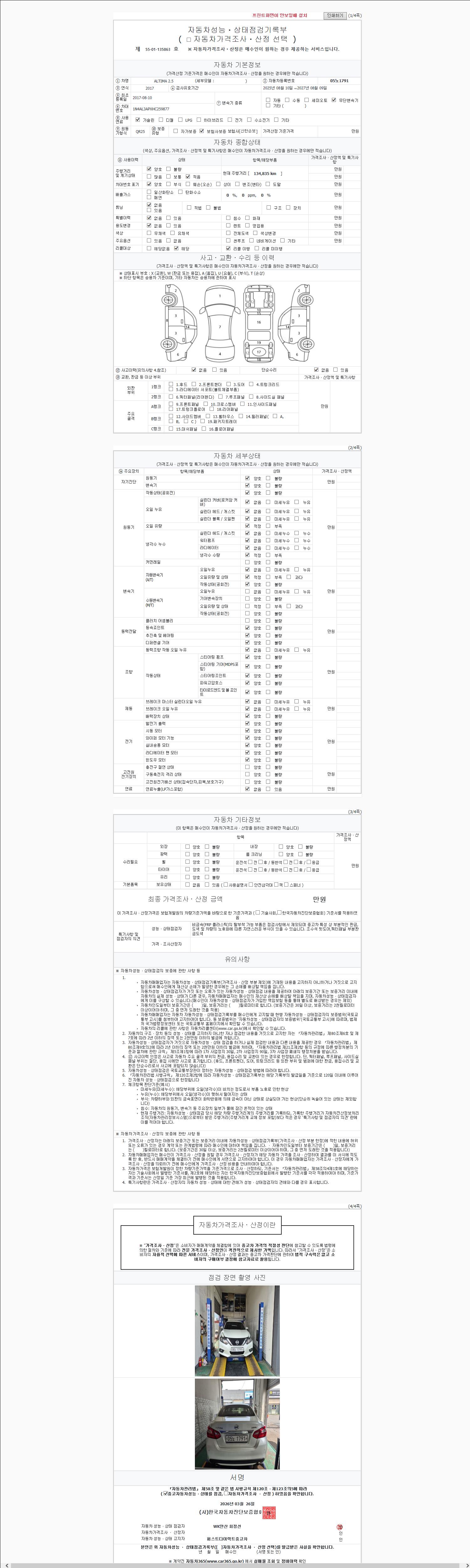 | 주행거리 | 134,833 km | 차량번호 | 05노1791 | 사고유무 | 성능기록부 참조 | 제시번호 | 제 2147483647 호 |