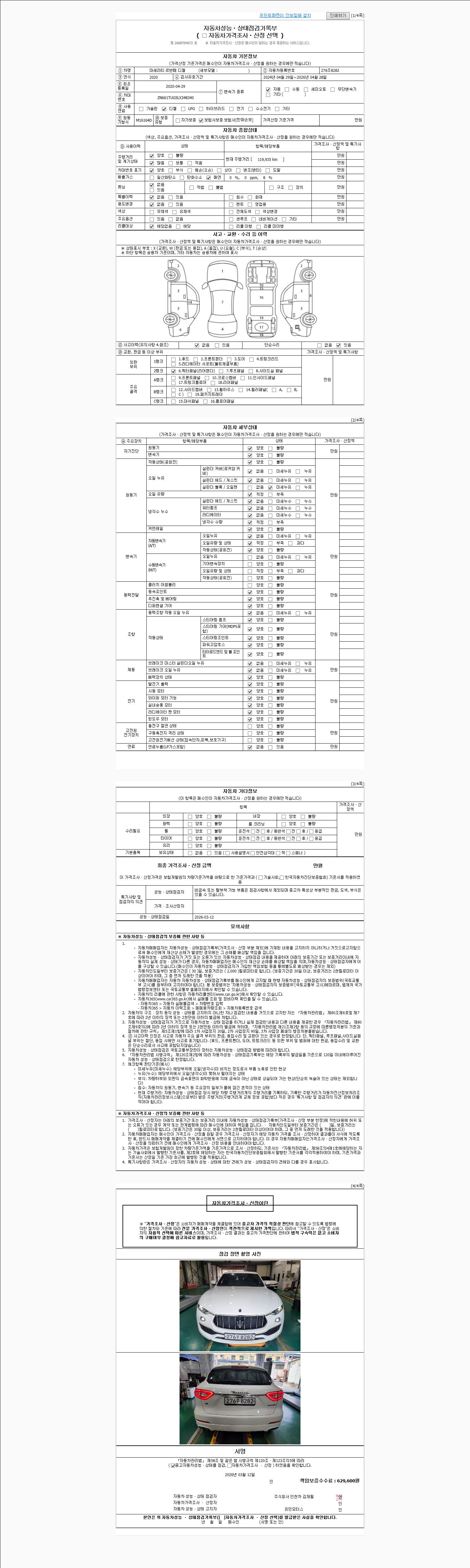 | 주행거리 | 119,935 km | 차량번호 | 276주8282 | 사고유무 | 성능기록부 참조 | 제시번호 | 제 2026012815 호 |