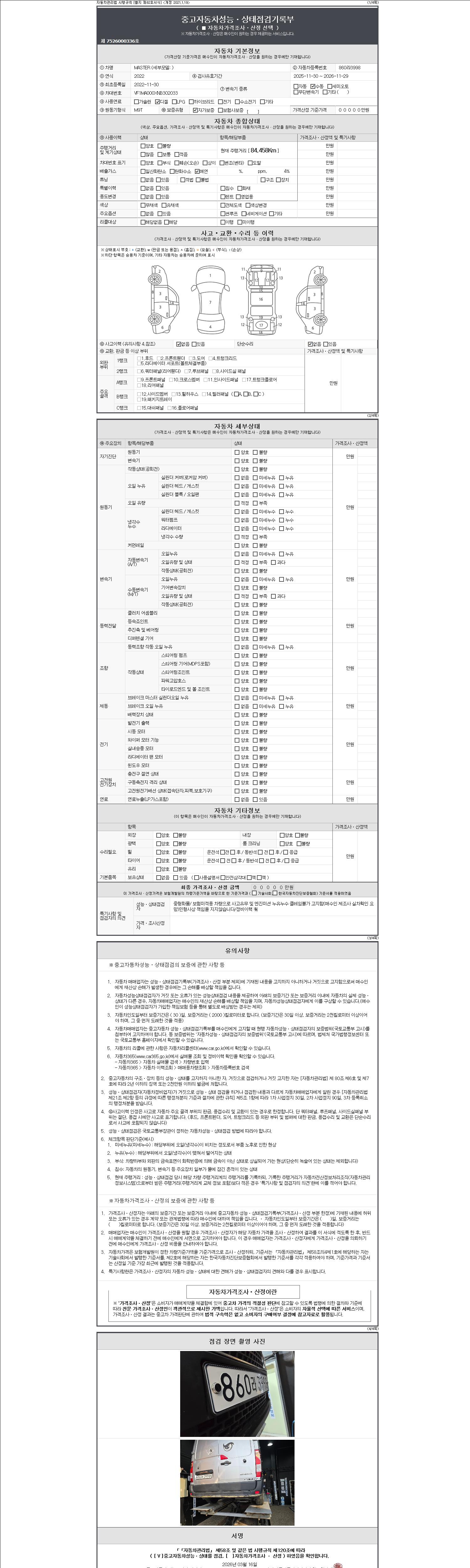자동차관리법 시행규칙 제120조의 규정에 따라 별지 제 82호서식 《중고자동차 성능, 상태점검 기록부》를 발행한 성능, 상태점검자 및 매매자는 아래의 보증기간 또는 보증거리 이내의 중고자동차, 성능점검 기록부에 기재된 내용과 자동차의 실제 성능, 상태가 다른 경우 계약 또는 관계법령에 따라 매수인에 대하여 책임을 집니다.