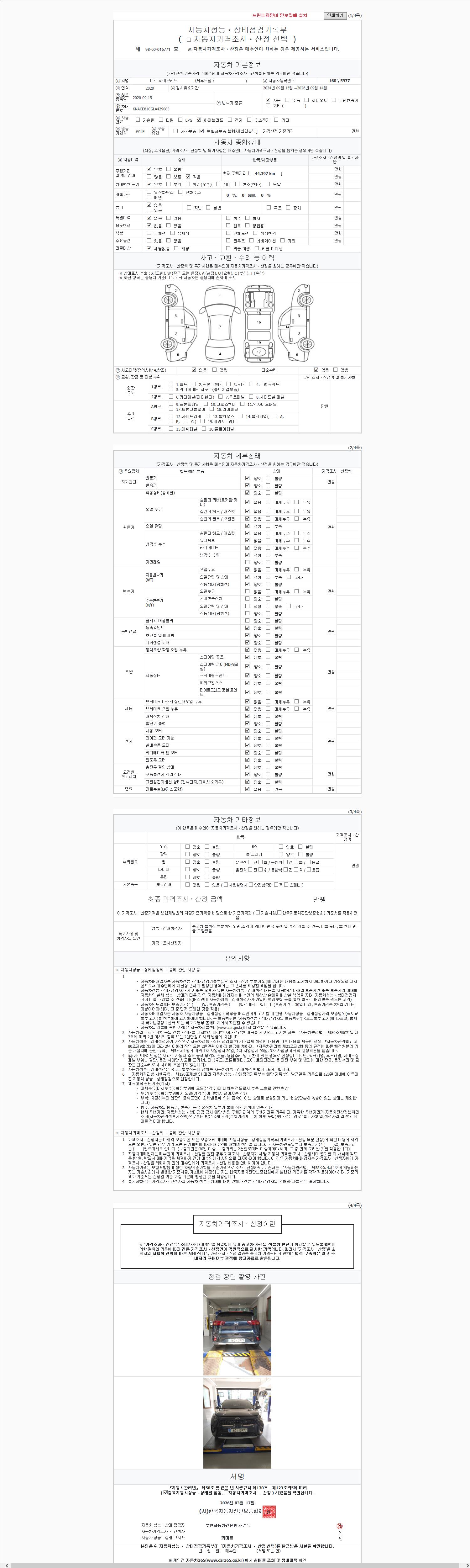 | 주행거리 | 44,000 km | 차량번호 | 160누5977 | 사고유무 | 성능기록부 참조 | 제시번호 | 제 2026048326 호 |