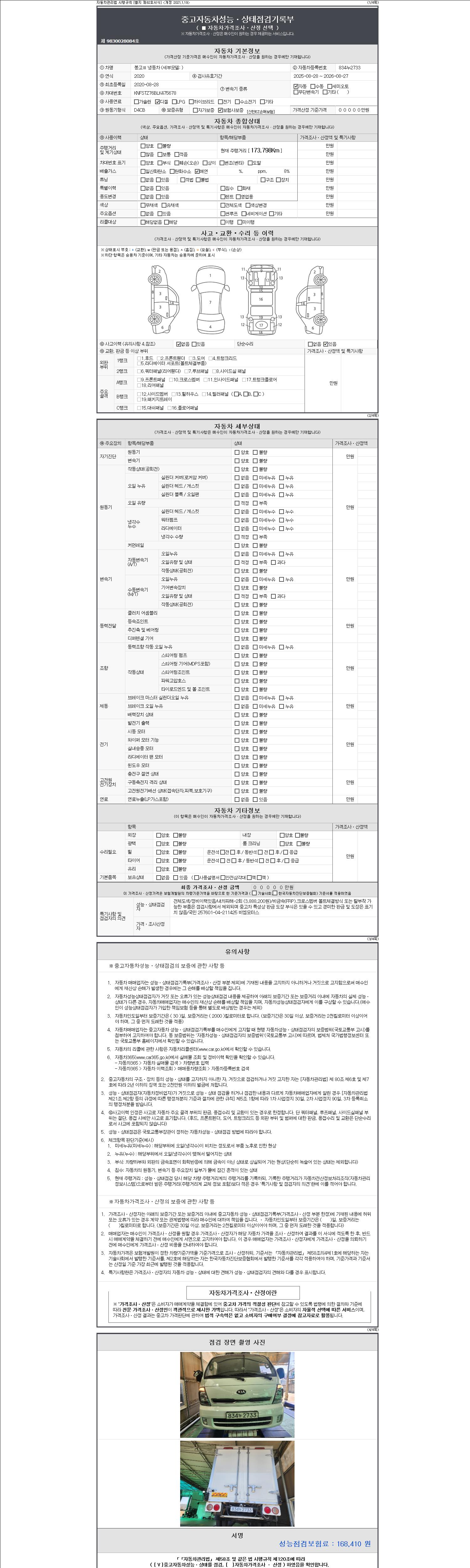 | 주행거리 | 173,798 km | 차량번호 | 834누2733 | 사고유무 | 성능기록부 참조 | 제시번호 | 제 2147483647 호 |