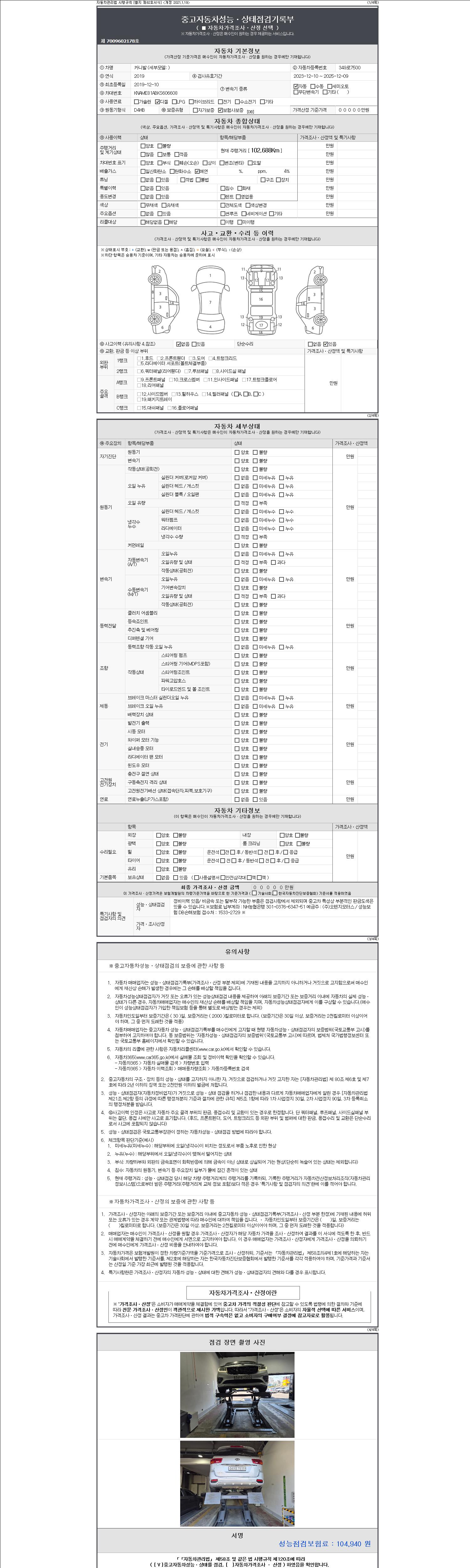 자동차관리법 시행규칙 제120조의 규정에 따라 별지 제 82호서식 《중고자동차 성능, 상태점검 기록부》를 발행한 성능, 상태점검자 및 매매자는 아래의 보증기간 또는 보증거리 이내의 중고자동차, 성능점검 기록부에 기재된 내용과 자동차의 실제 성능, 상태가 다른 경우 계약 또는 관계법령에 따라 매수인에 대하여 책임을 집니다.