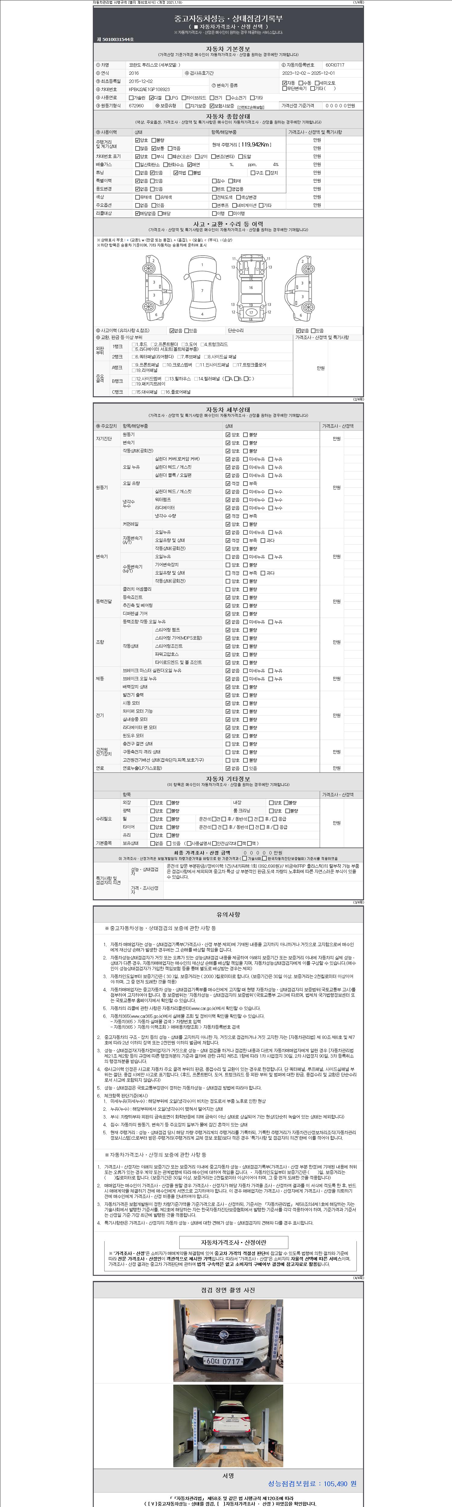 | 주행거리 | 119,920 km | 차량번호 | 60더0717 | 사고유무 | 성능기록부 참조 | 제시번호 | 제 2147483647 호 |