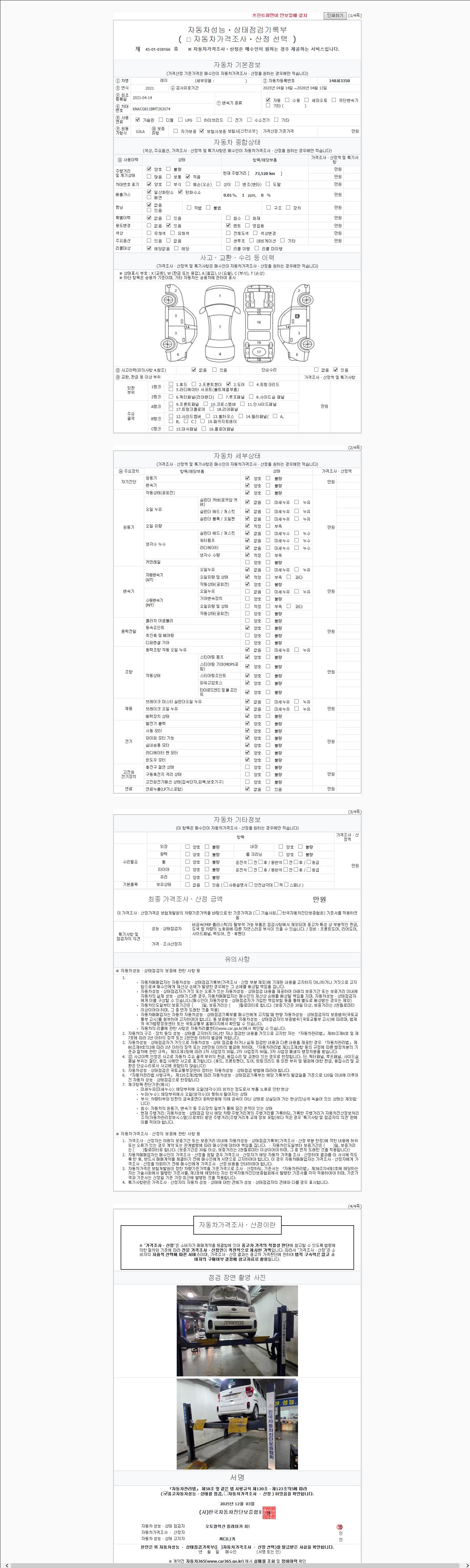 주행거리 73,520 km 차량번호 148서3350 사고유무 성능기록부 참조 제시번호 제 2147483647 호