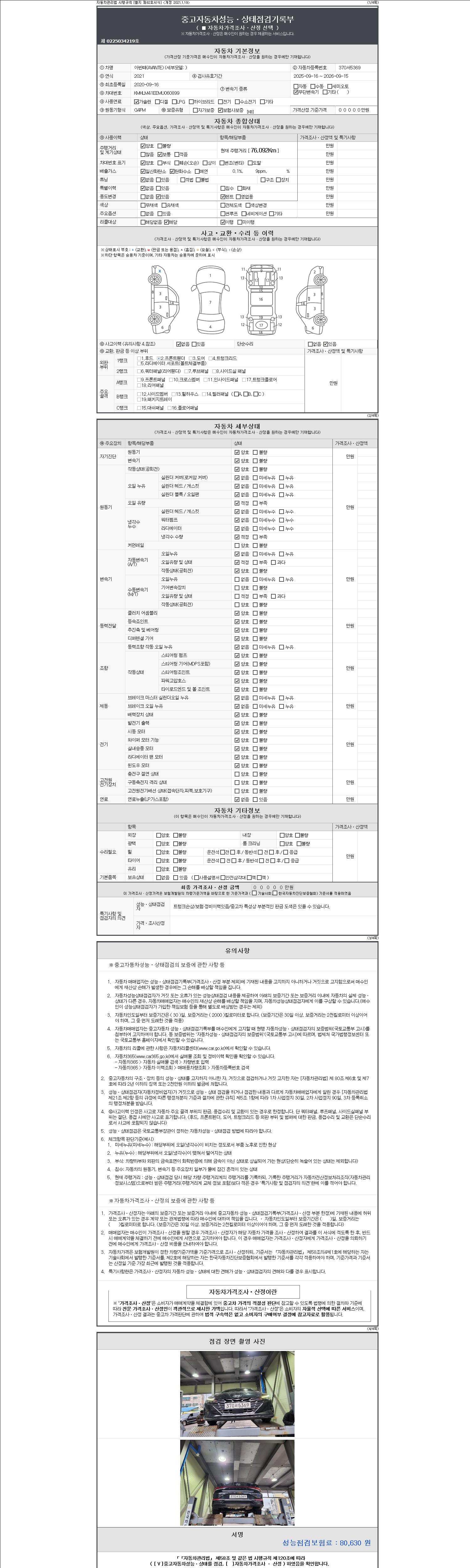 | 주행거리 | 76,092 km | 차량번호 | 370서5369 | 사고유무 | 성능기록부 참조 | 제시번호 | 제 2147483647 호 |