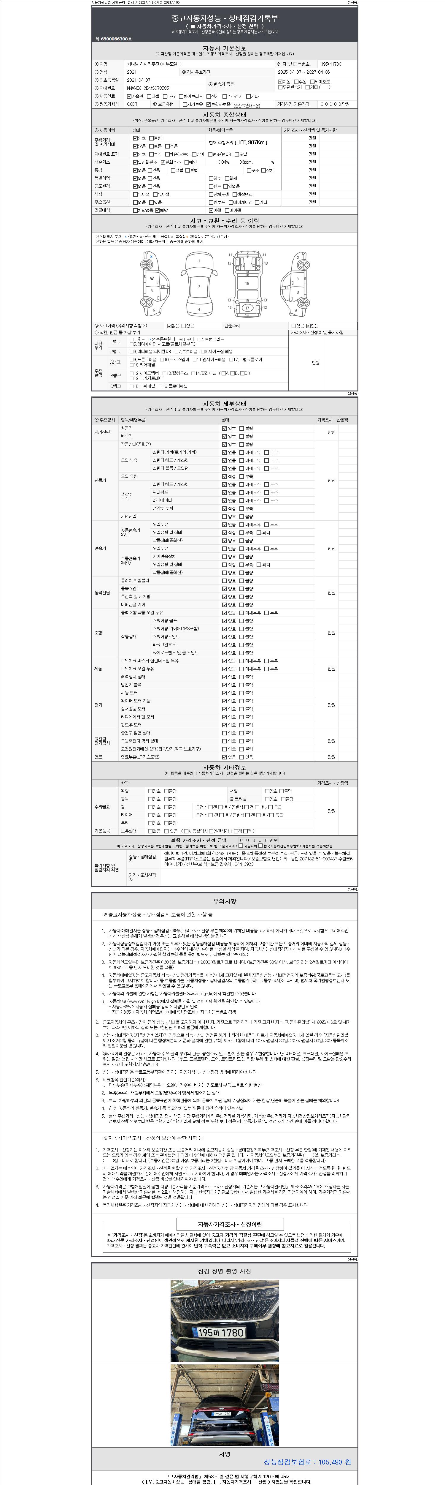 | 주행거리 | 105,907 km | 차량번호 | 195머1780 | 사고유무 | 성능기록부 참조 | 제시번호 | 제 2147483647 호 |