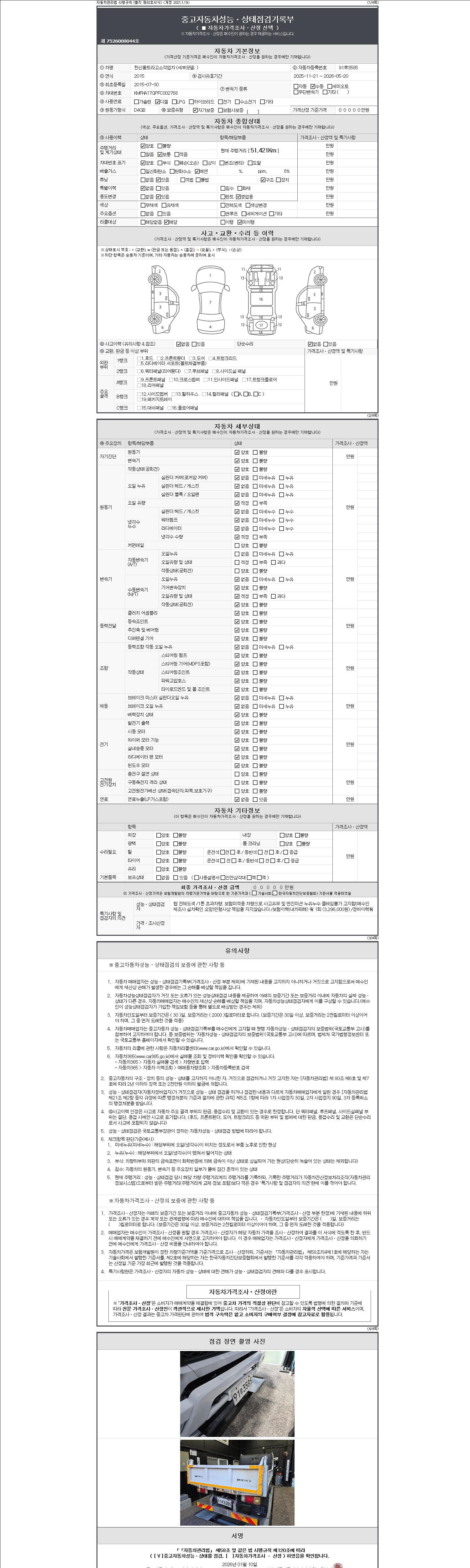-중고자동차 매매업자를 통해 차량을 구입하실 경우 반드시 "중고자동차 성능, 상태점검 기록부"를 교뷰 받으셔야 하며, 매매업자는 반드시 의무 교부 하여야 압니다.