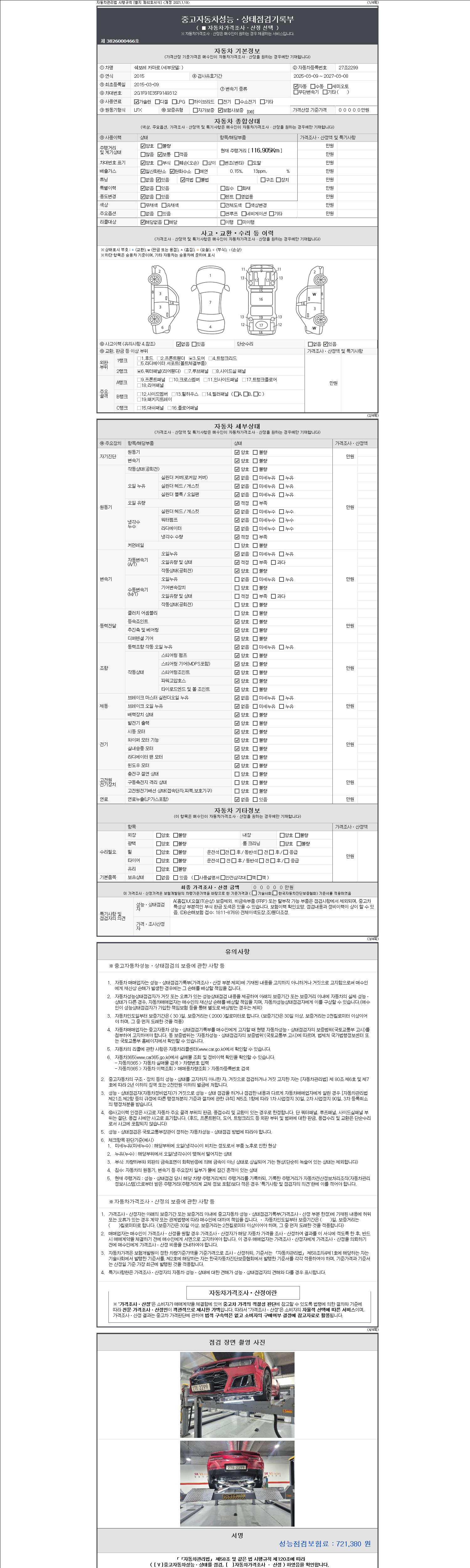 자동차관리법 시행규칙 제120조의 규정에 따라 별지 제 82호서식 《중고자동차 성능, 상태점검 기록부》를 발행한 성능, 상태점검자 및 매매자는 아래의 보증기간 또는 보증거리 이내의 중고자동차, 성능점검 기록부에 기재된 내용과 자동차의 실제 성능, 상태가 다른 경우 계약 또는 관계법령에 따라 매수인에 대하여 책임을 집니다.