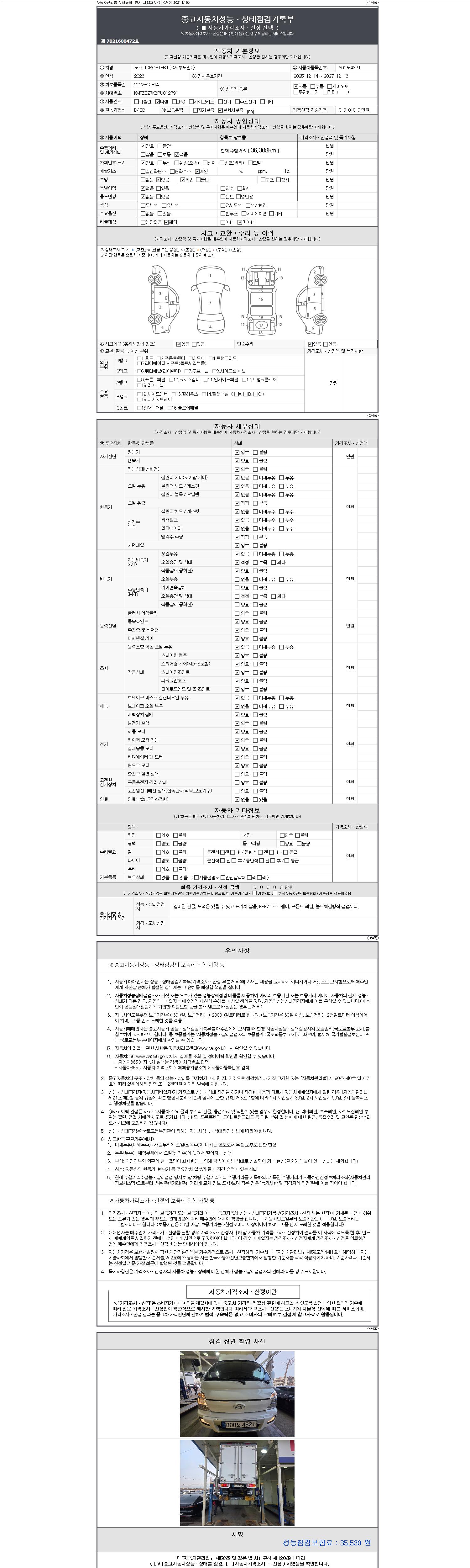 | 주행거리 | 36,308 km | 차량번호 | 800노4821 | 사고유무 | 성능기록부 참조 | 제시번호 | 제 2147483647 호 |