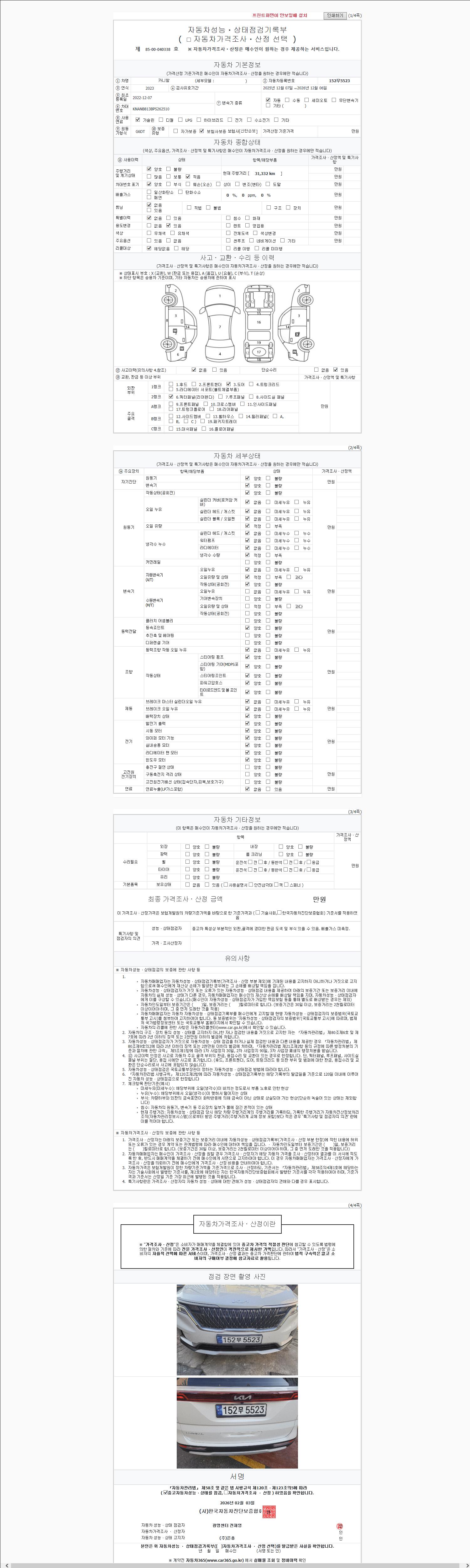 | 주행거리 | 31,304 km | 차량번호 | 152무5523 | 사고유무 | 성능기록부 참조 | 제시번호 | 제 2147483647 호 |