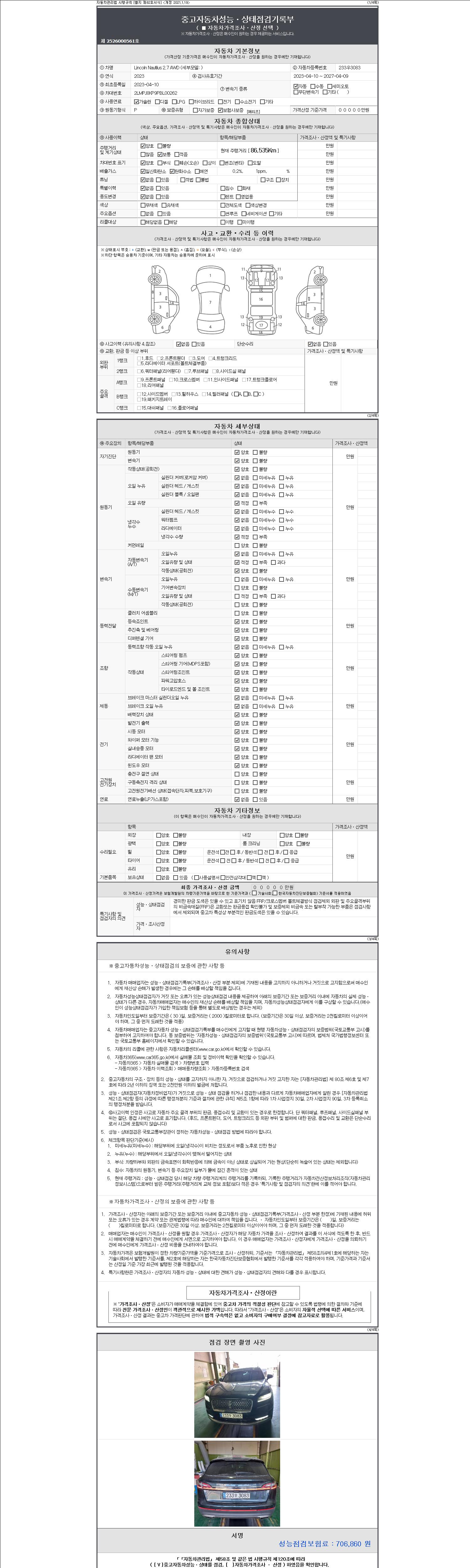 | 주행거리 | 86,535 km | 차량번호 | 233우3083 | 사고유무 | 성능기록부 참조 | 제시번호 | 제 2147483647 호 |