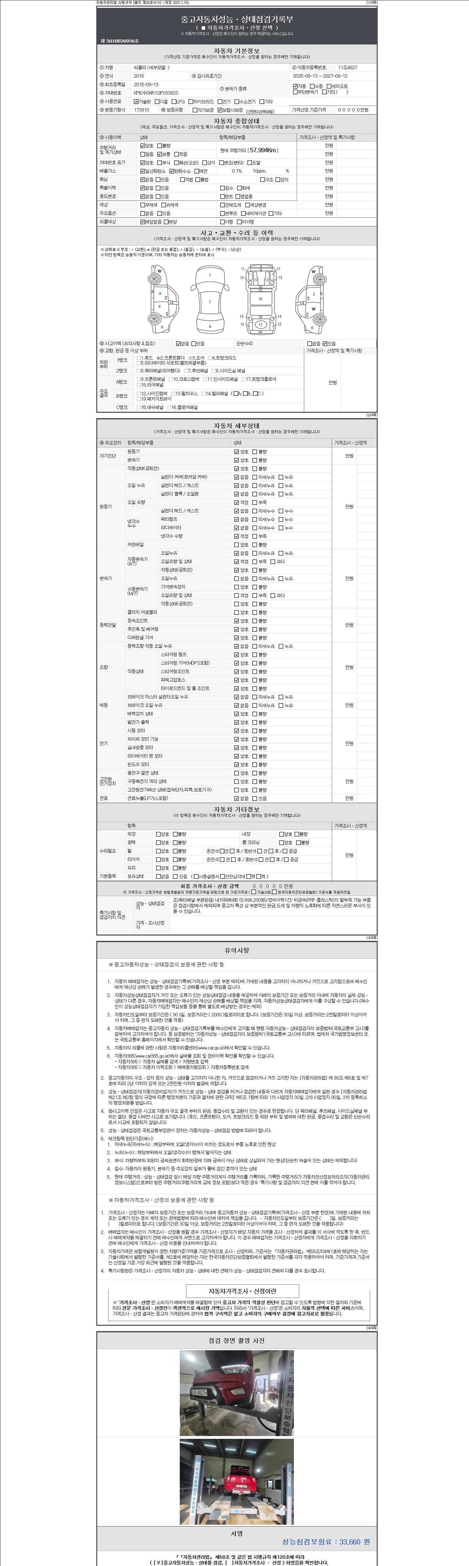 자동차관리법 시행규칙 제120조의 규정에 따라 별지 제 82호서식 《중고자동차 성능, 상태점검 기록부》를 발행한 성능, 상태점검자 및 매매자는 아래의 보증기간 또는 보증거리 이내의 중고자동차, 성능점검 기록부에 기재된 내용과 자동차의 실제 성능, 상태가 다른 경우 계약 또는 관계법령에 따라 매수인에 대하여 책임을 집니다.