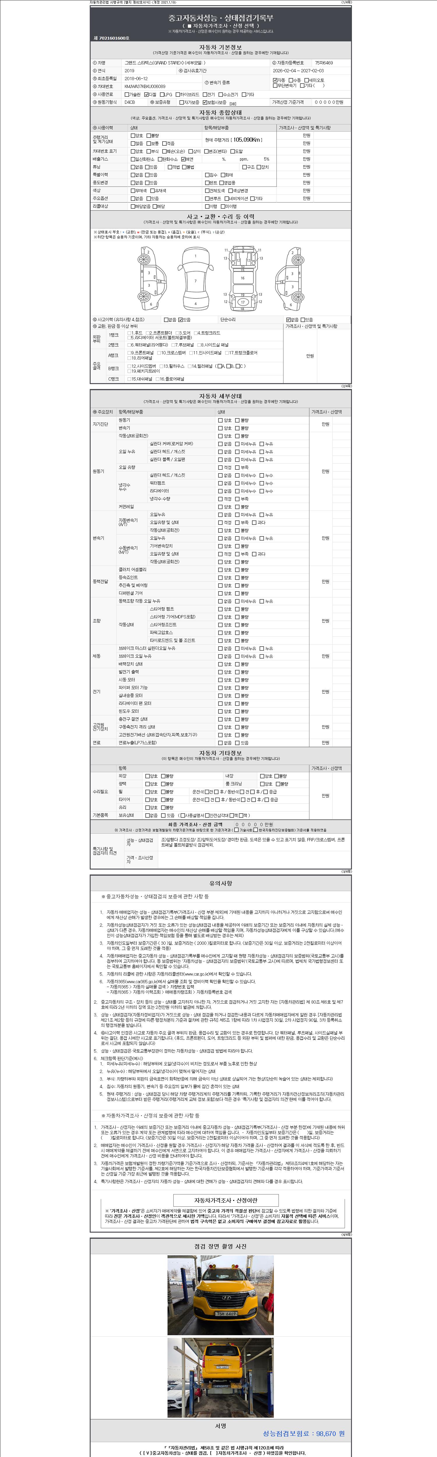 | 주행거리 | 105,090 km | 차량번호 | 75마6469 | 사고유무 | 성능기록부 참조 | 제시번호 | 제 2147483647 호 |