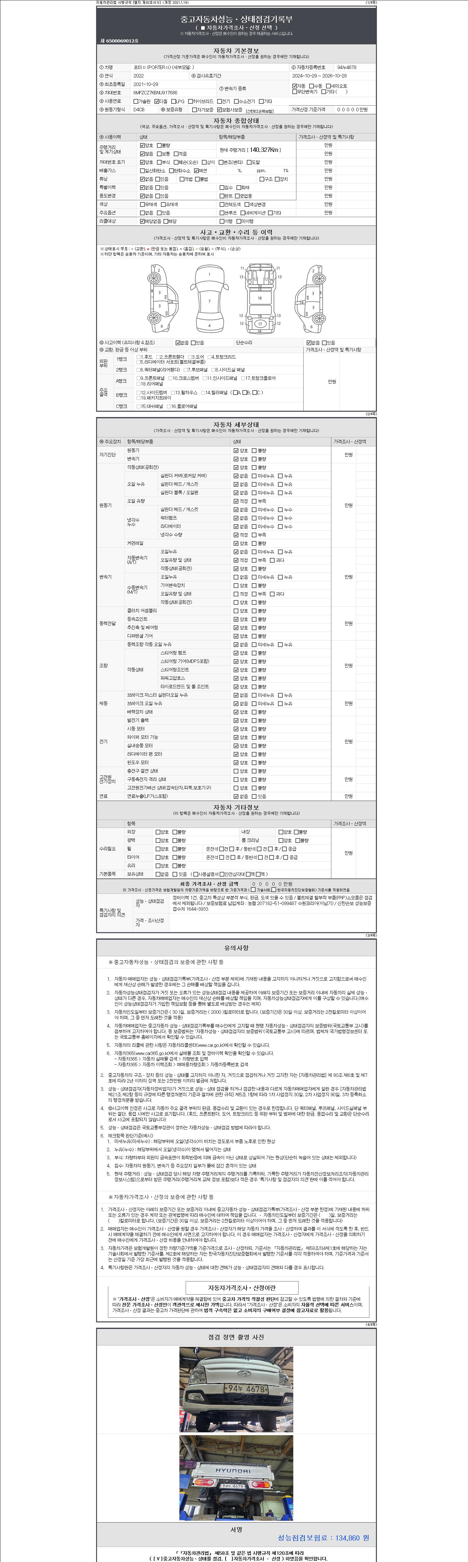 | 주행거리 | 140,327 km | 차량번호 | 94누4678 | 사고유무 | 성능기록부 참조 | 제시번호 | 제 2147483647 호 |