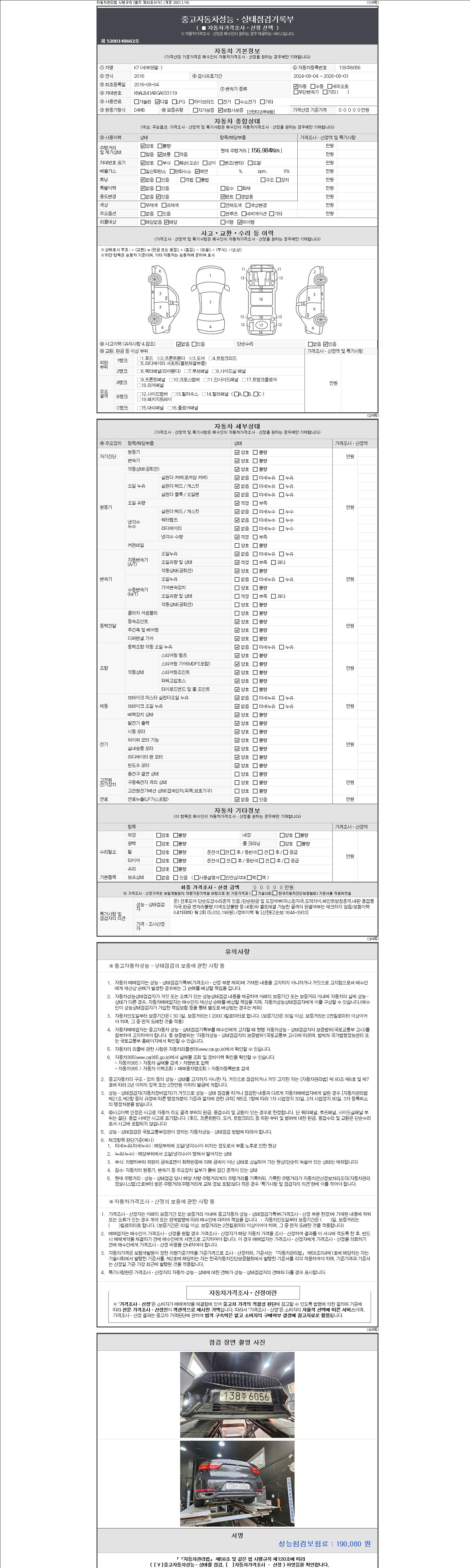 | 주행거리 | 156,984 km | 차량번호 | 138주6056 | 사고유무 | 성능기록부 참조 | 제시번호 | 제 2147483647 호 |