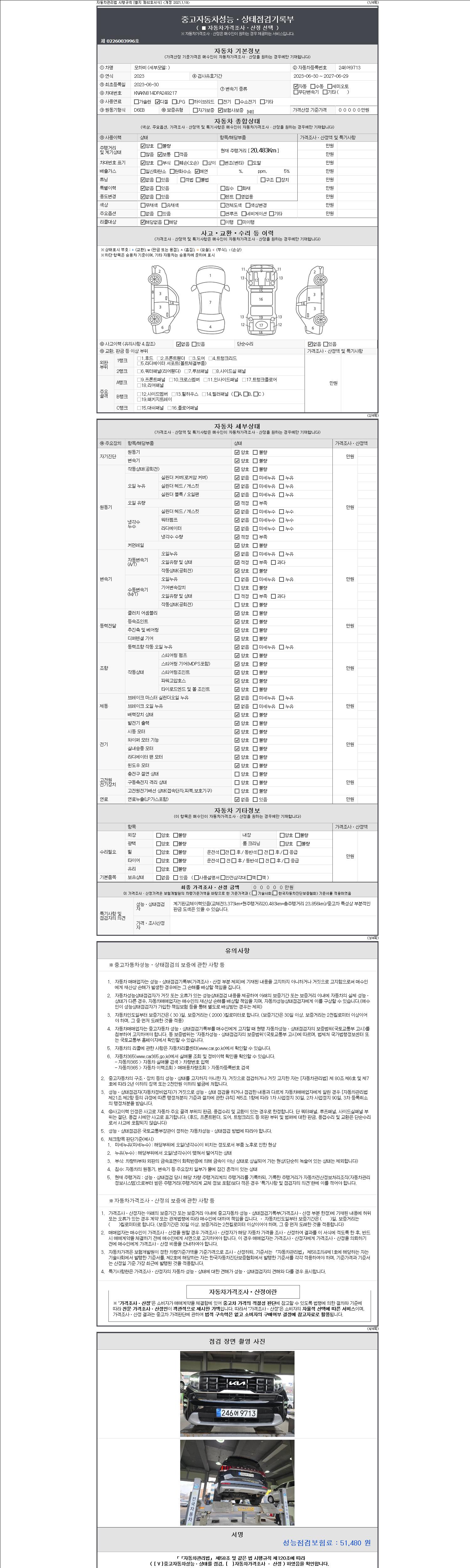 | 주행거리 | 20,483 km | 차량번호 | 246어9713 | 사고유무 | 성능기록부 참조 | 제시번호 | 제 2147483647 호 |