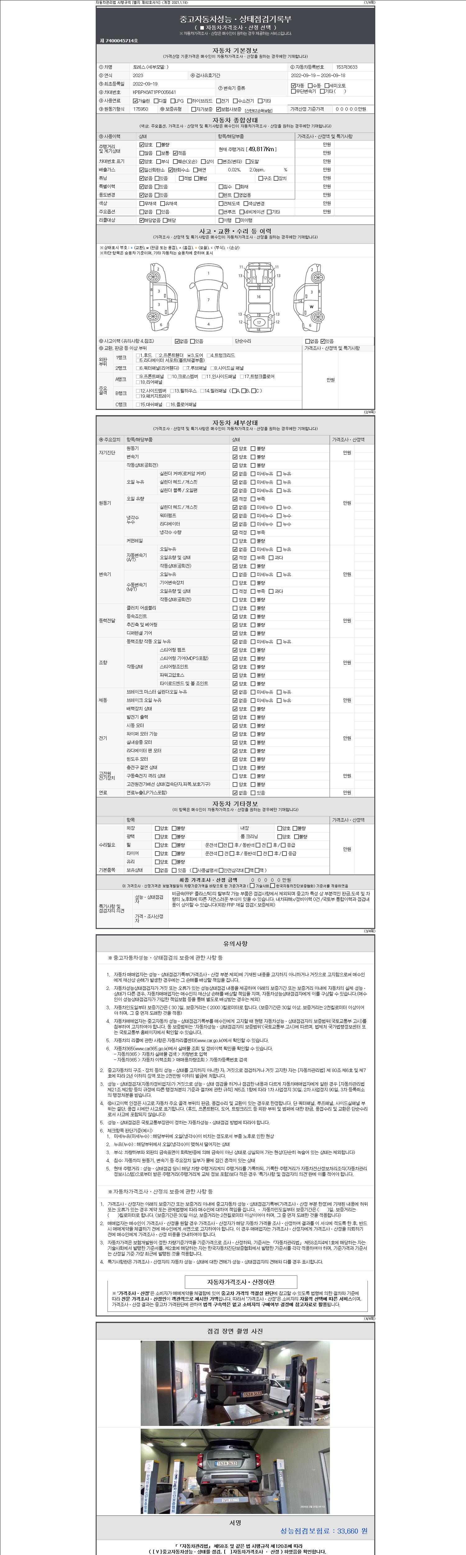 자동차관리법 시행규칙 제120조의 규정에 따라 별지 제 82호서식 《중고자동차 성능, 상태점검 기록부》를 발행한 성능, 상태점검자 및 매매자는 아래의 보증기간 또는 보증거리 이내의 중고자동차, 성능점검 기록부에 기재된 내용과 자동차의 실제 성능, 상태가 다른 경우 계약 또는 관계법령에 따라 매수인에 대하여 책임을 집니다.