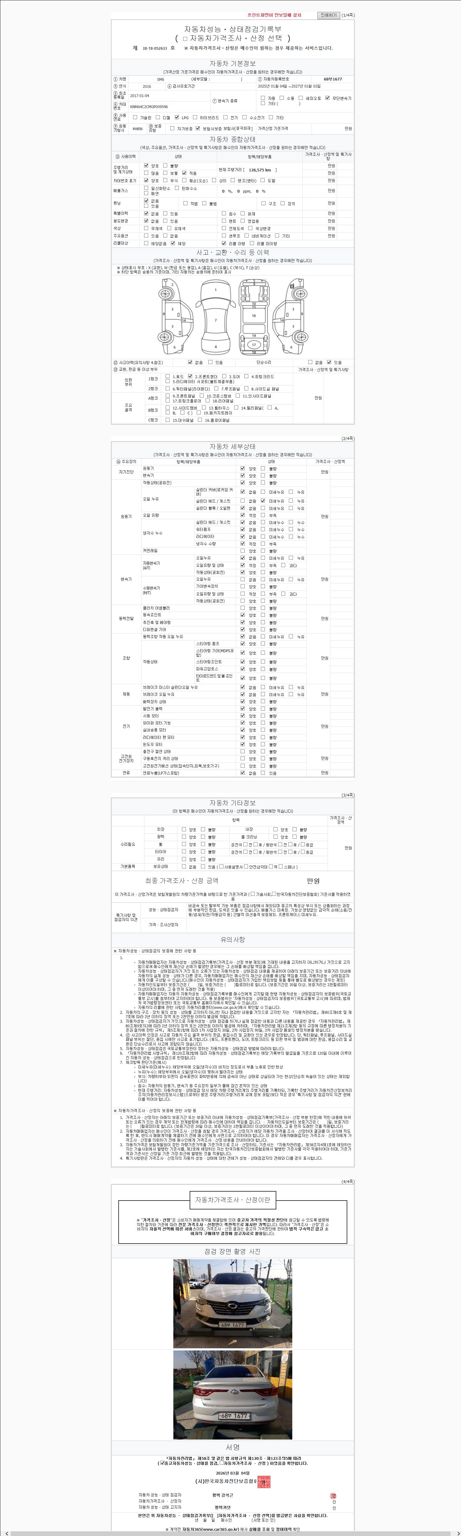 | 주행거리 | 126,575 km | 차량번호 | 68부1677 | 사고유무 | 성능기록부 참조 | 제시번호 | 제 2147483647 호 |