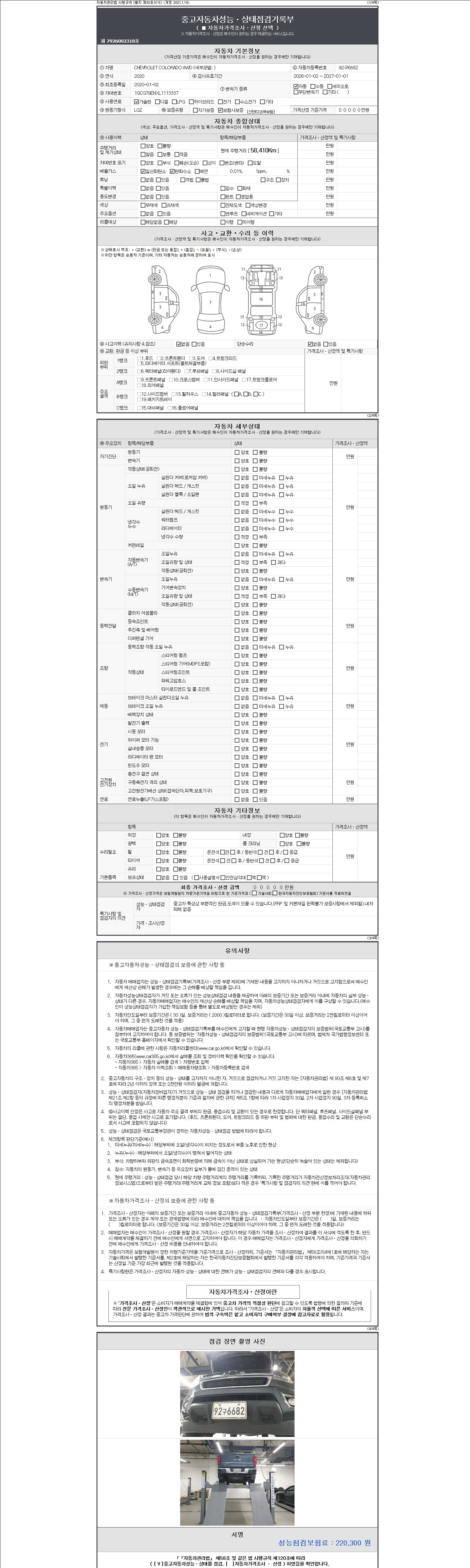 | 주행거리 | 58,410 km | 차량번호 | 92구6682 | 사고유무 | 성능기록부 참조 | 제시번호 | 제 2147483647 호 |