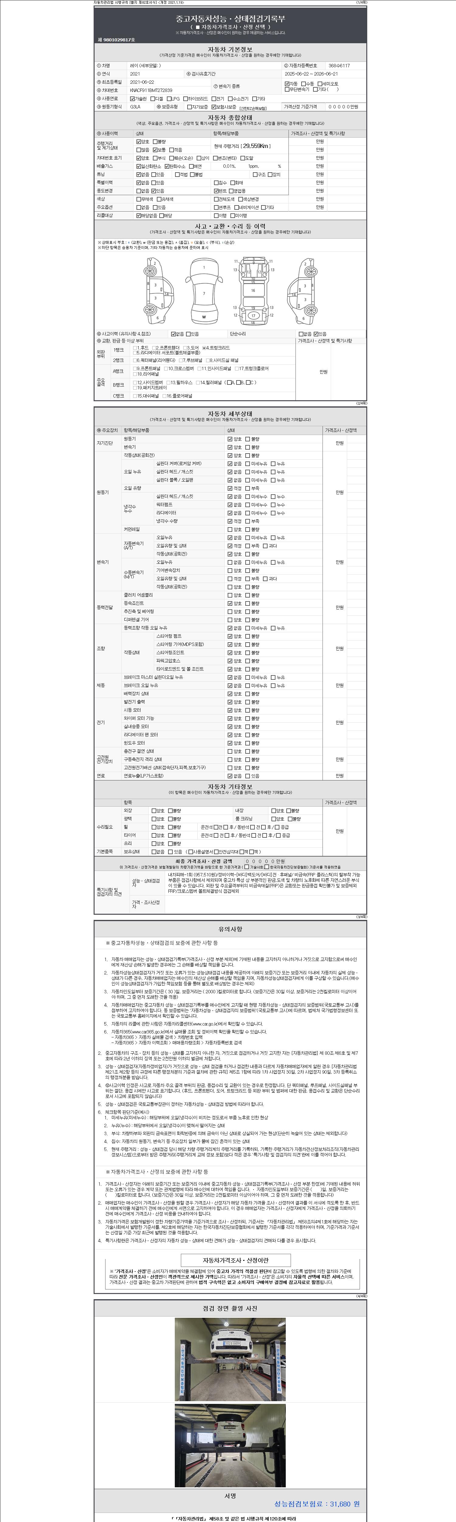 | 주행거리 | 29,559 km | 차량번호 | 368수6117 | 사고유무 | 성능기록부 참조 | 제시번호 | 제 2147483647 호 |