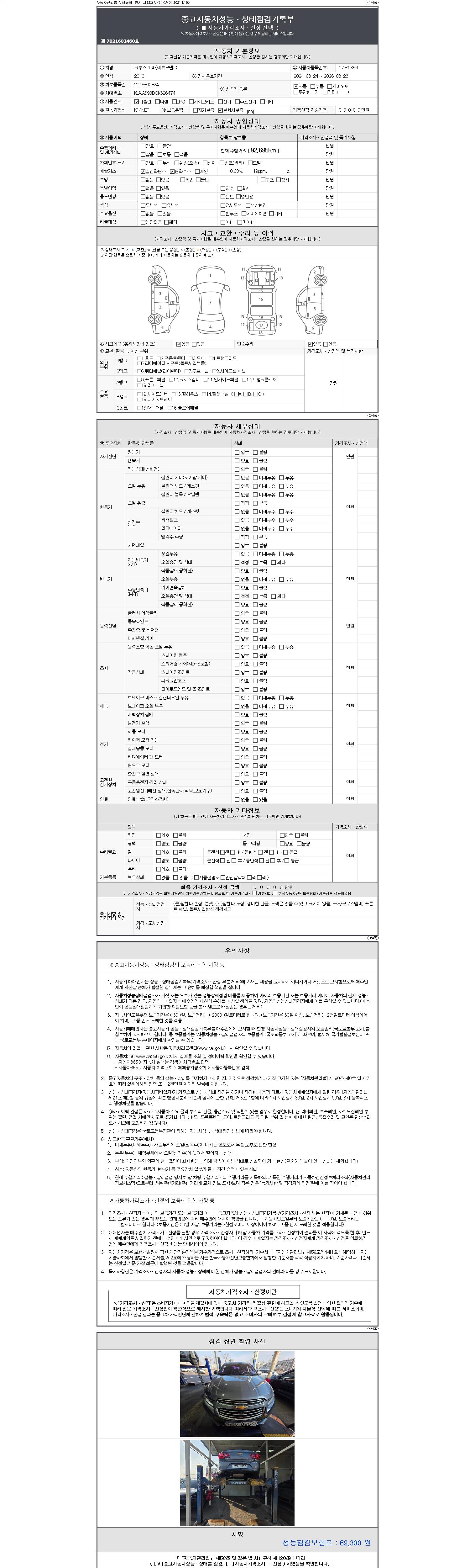 자동차관리법 시행규칙 제120조의 규정에 따라 별지 제 82호서식 《중고자동차 성능, 상태점검 기록부》를 발행한 성능, 상태점검자 및 매매자는 아래의 보증기간 또는 보증거리 이내의 중고자동차, 성능점검 기록부에 기재된 내용과 자동차의 실제 성능, 상태가 다른 경우 계약 또는 관계법령에 따라 매수인에 대하여 책임을 집니다.