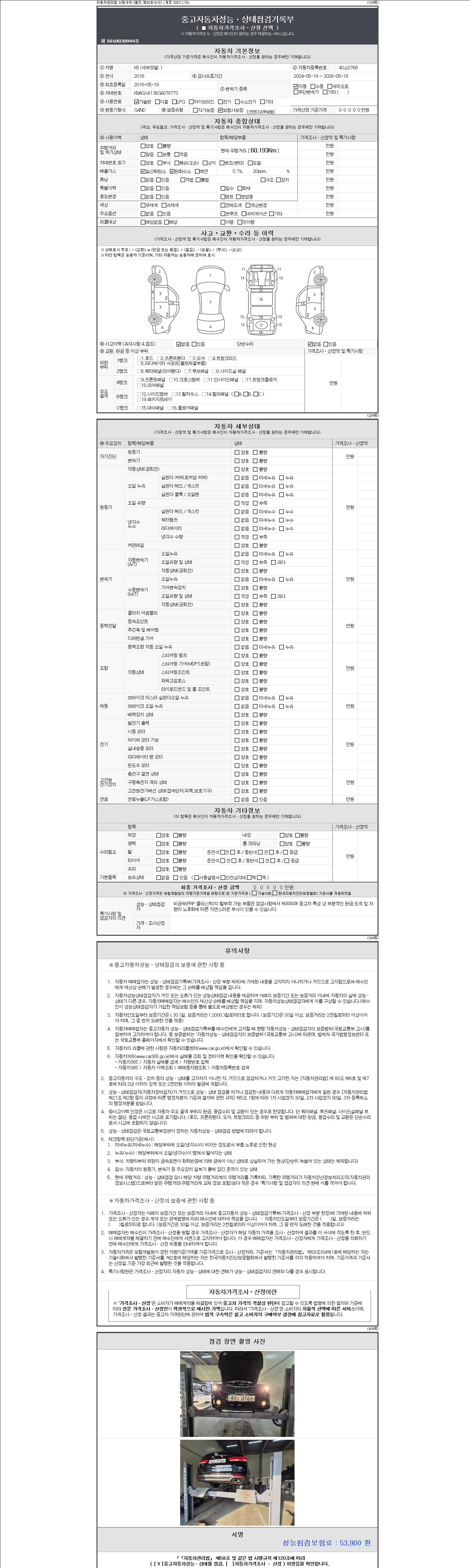 자동차관리법 시행규칙 제120조의 규정에 따라 별지 제 82호서식 《중고자동차 성능, 상태점검 기록부》를 발행한 성능, 상태점검자 및 매매자는 아래의 보증기간 또는 보증거리 이내의 중고자동차, 성능점검 기록부에 기재된 내용과 자동차의 실제 성능, 상태가 다른 경우 계약 또는 관계법령에 따라 매수인에 대하여 책임을 집니다.